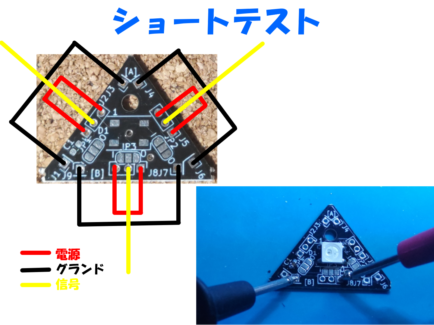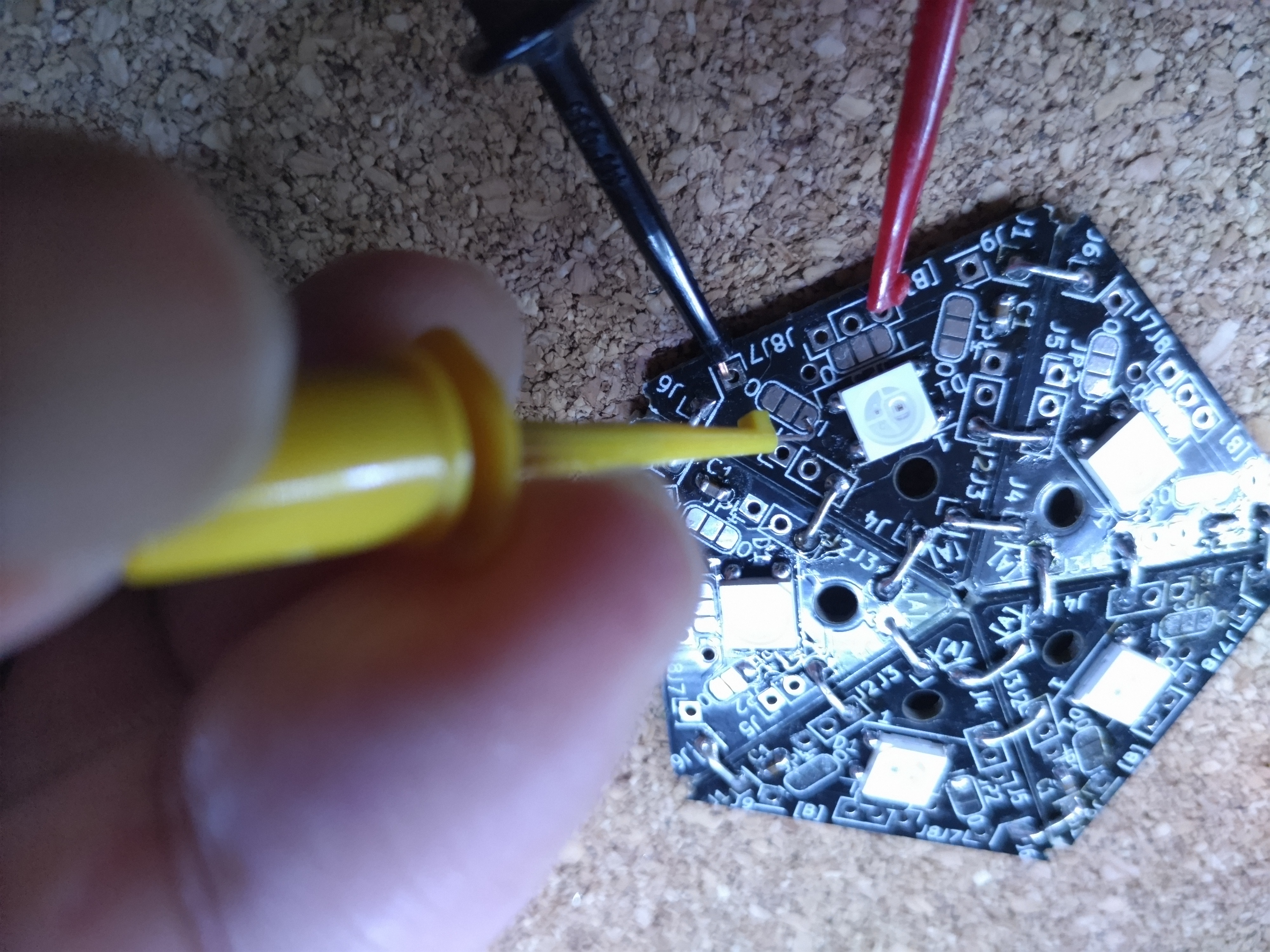 点灯するかどうかは組みあがった状態では難しいので、下の写真の様に電源だけ繋いでおいて、信号線はどこでもいいので、はんだジャンパーの I 側のパッドにプローブクリップを直接接触させます。それを五角形なら5個分と三角形の数だけ繰り返して、パネル上全部が問題無く点灯することを確認します。