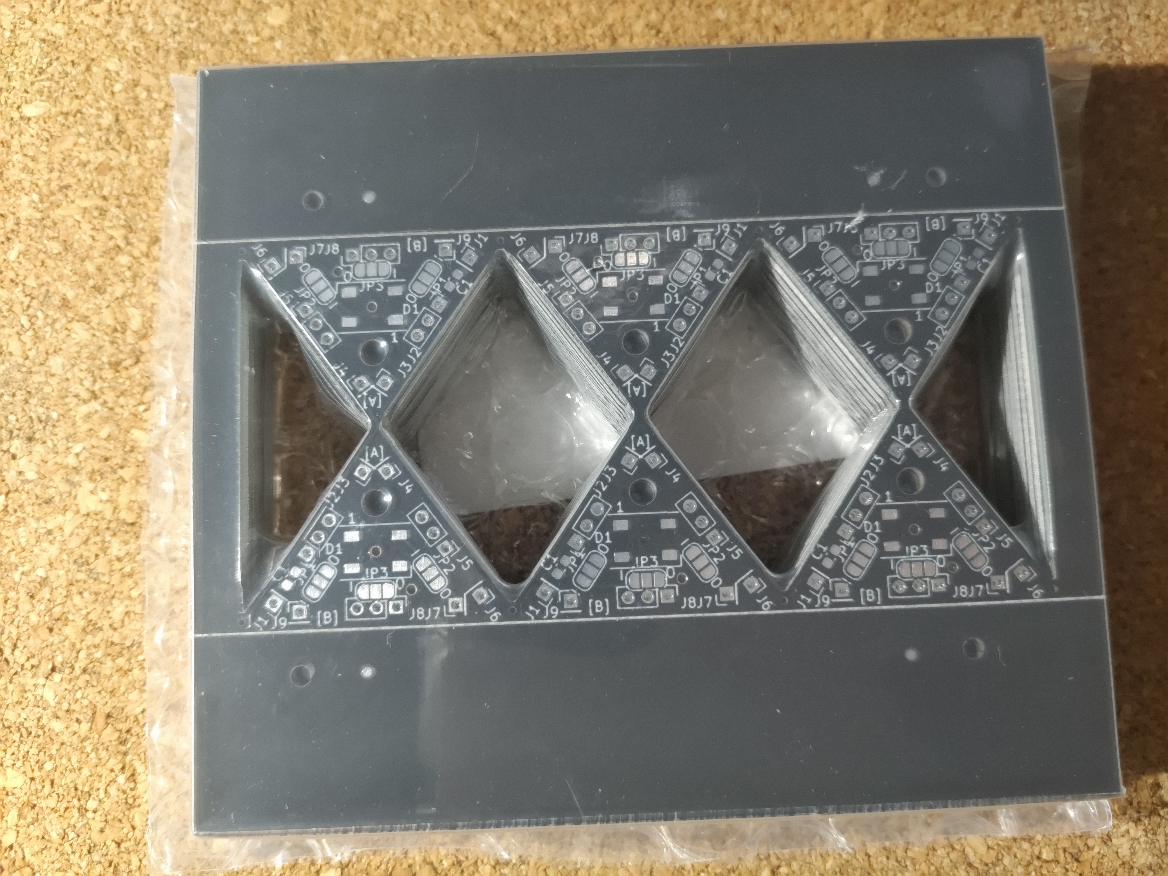 LED球体を作る最も基本かつ重要となる部品です。球体を構成するために計算された二等辺三角形の板であり、LEDを実装して通電するための電子基板でもあります。