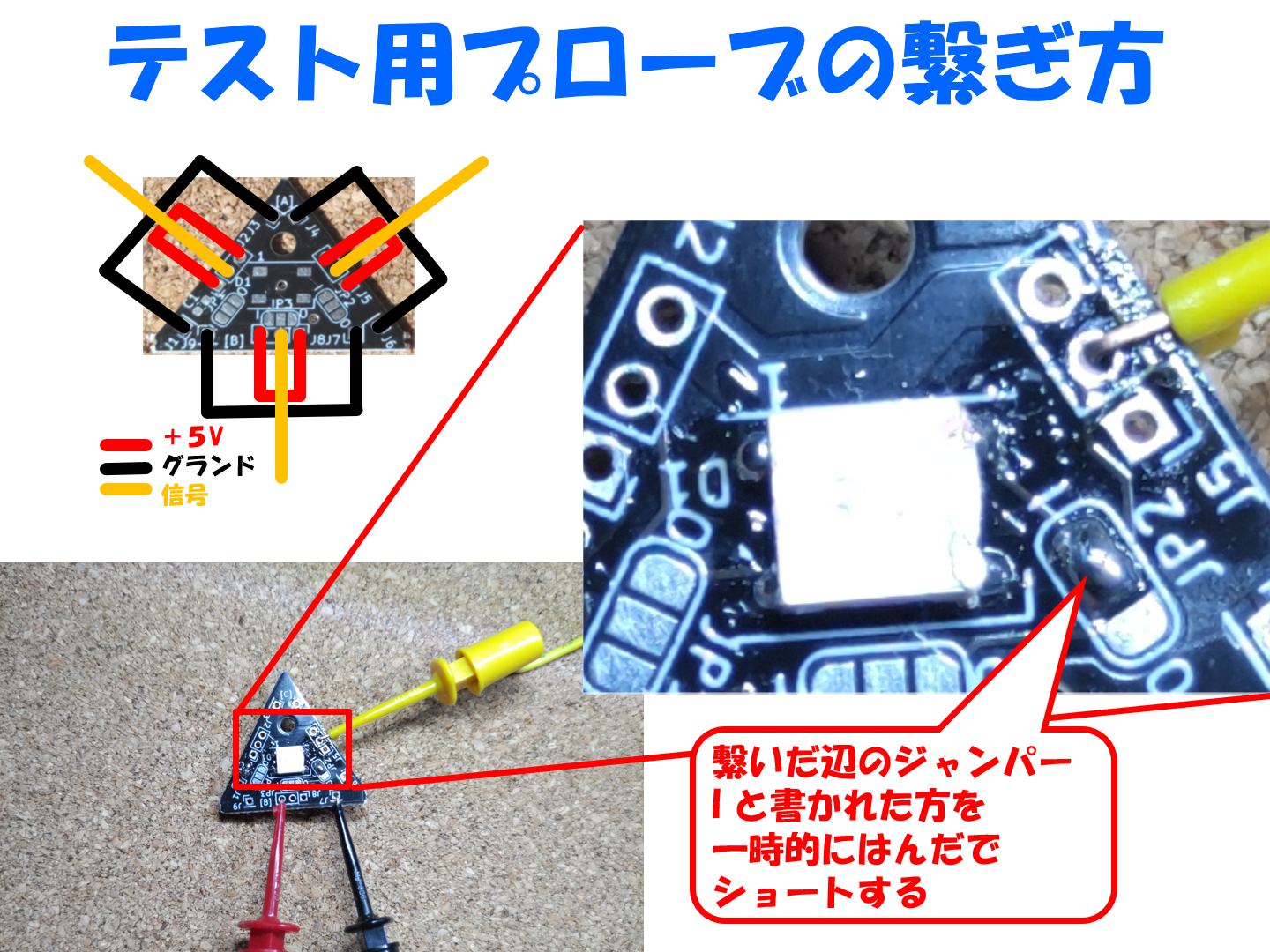 そして、一度いずれか一辺のはんだジャンパーの "I" と書かれている方を一時的にショートします。(写真上では右側の辺)そしてその信号線用のプローブはジャンパーした辺の真ん中に接続します。