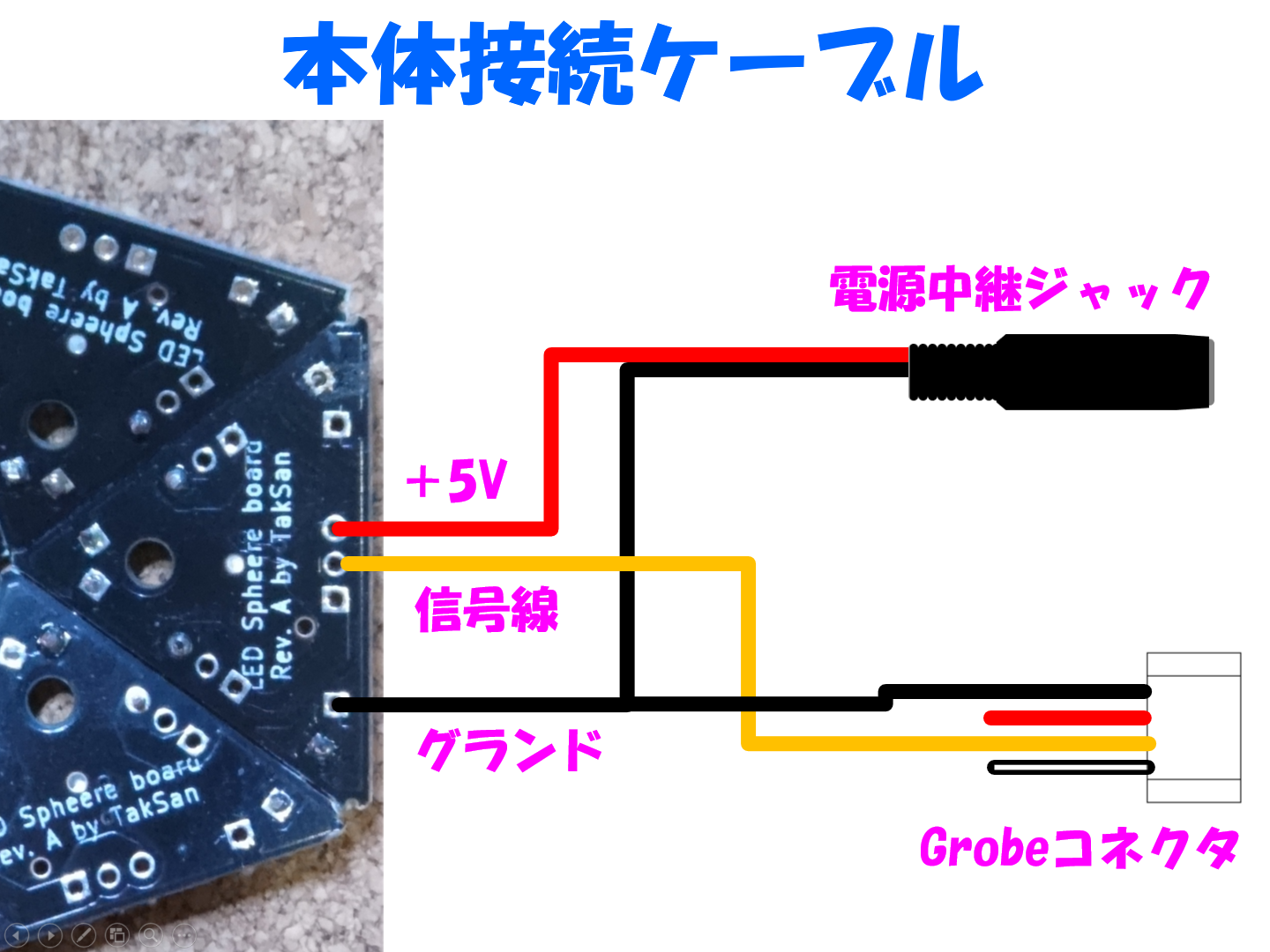 Grobe コネクタの切断部に繋いで延長した電線を五角形基板の表から穴を通して、裏側で接続します。太さAWG26なら3本がギリギリ通るはずです。