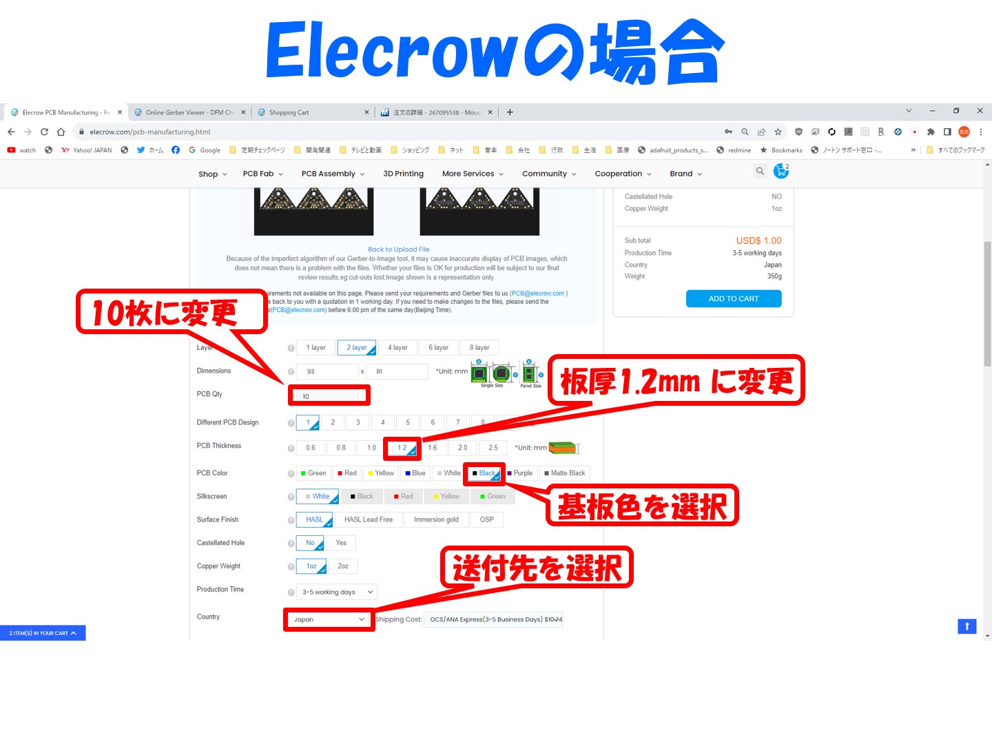 基板発注するお勧めは中国にある Elecrow です。1日1種類10枚までがキャンペーン価格の $1 になります。1日10枚ずつ、Type-Cx10枚 → Type-A x 10枚 → Type-C x 10枚 という様に3日掛けてカートに入れていき、3日目に発注すると $3 + 送料だけで済みます。ただし、登録を含め、発注はすべて英語で行うことになります。特に問い合わせることはないと思うので、英語に自信ない方でも翻訳駆使すればなんとかなると思います。