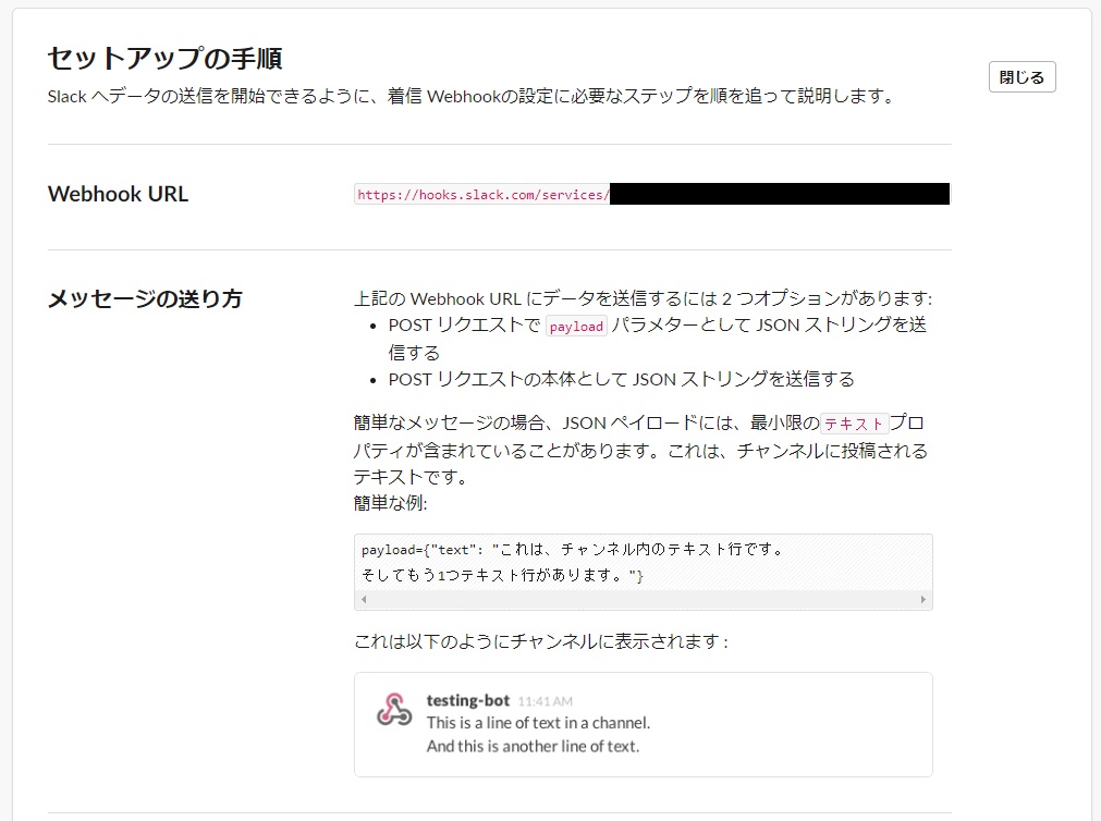 遷移先のページにWebhook URLが書いてあるのでこれを後ほど使います。