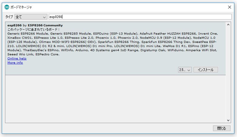 ボードマネージャのウインドウが開くので「esp8266」で検索し、出てきたパッケージをインストールします。