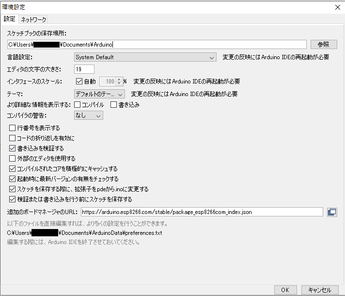 環境設定のウインドウが開くので、下部にある「追加のボードマネージャのURL」にhttps://arduino.esp8266.com/stable/package_esp8266com_index.jsonを追加してOKボタンを押します。