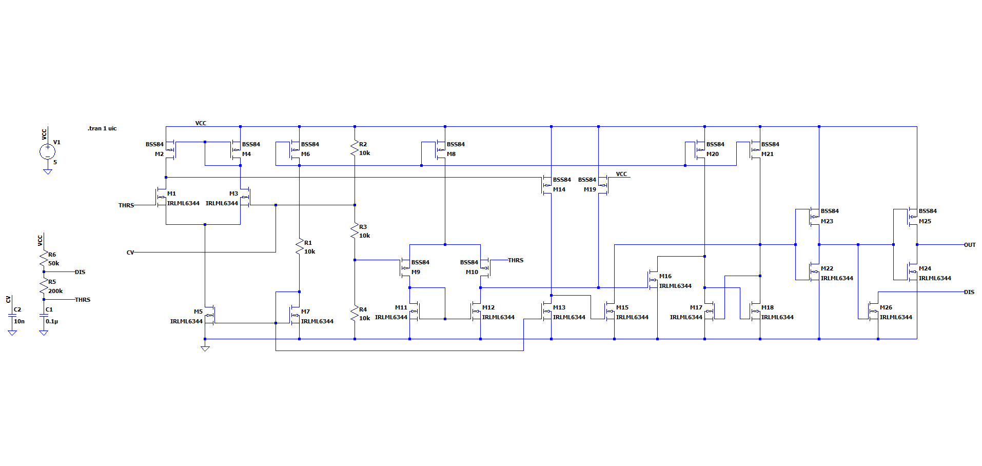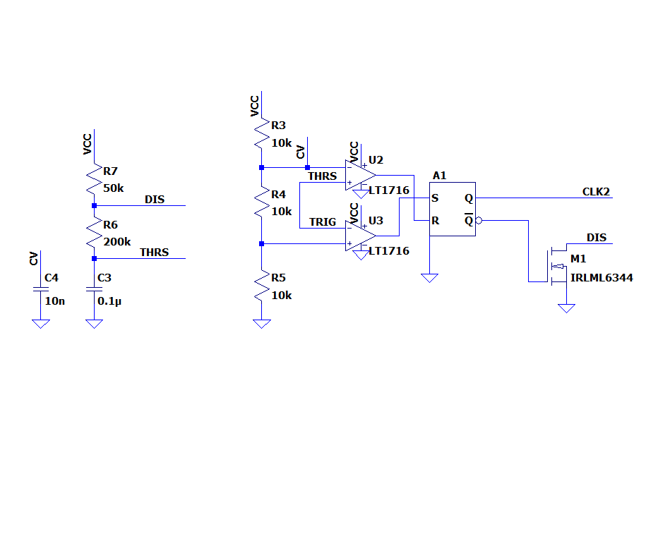 NE555の中身を市販のコンパレータ、SRラッチ、NMOSでつくった回路がこちらです。