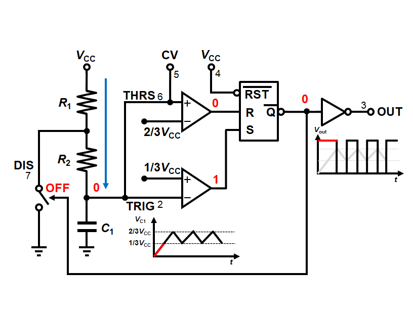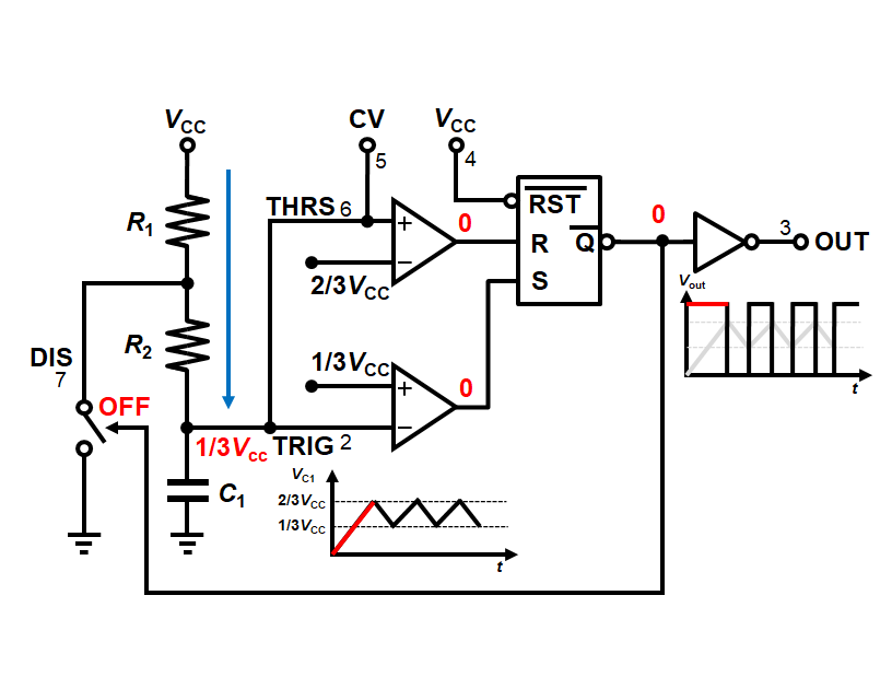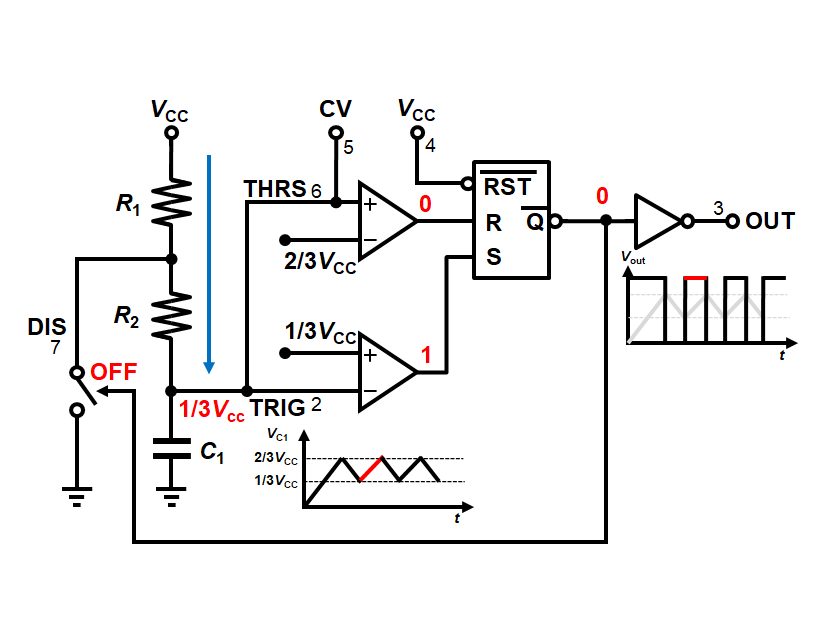 コンデンサの電圧が1/3Vccにまで下がると、再び下側のコンパレータ出力が1となり、SRラッチは1を保持します。このときの~Qは0となりNMOSがOFFすることで、再び充電が開始されます。