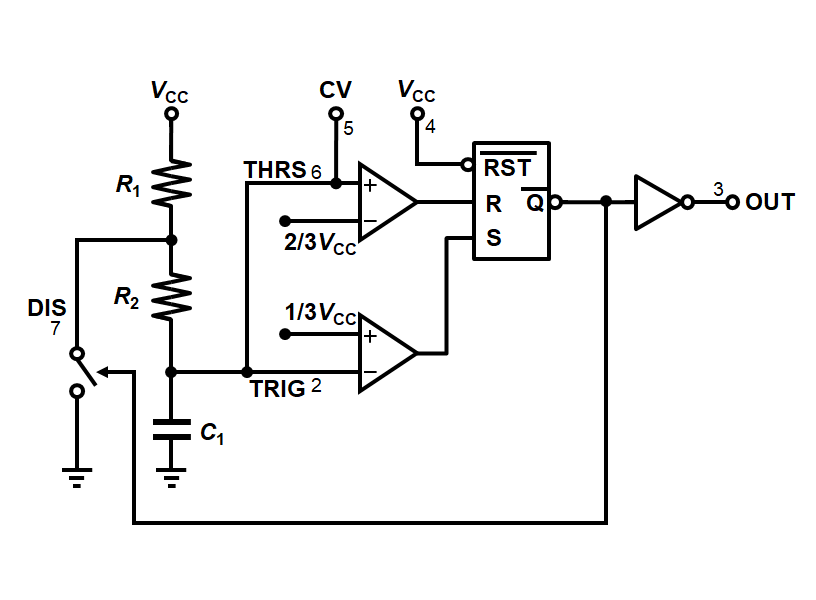 もうなんとなくわかった方はいるかと思いますが、NE555はC1とR1の間の電圧をコンパレータで読み取って、その電圧に応じてNMOS(スイッチ)をON/OFFし、C1を充放電しています。