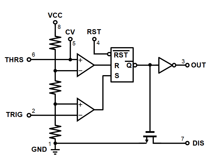 ICの中身には、2個のコンパレータ、1個のSRラッチ、n-channel MOSFET(またはnpnトランジスタ)、3個の抵抗からなっています。