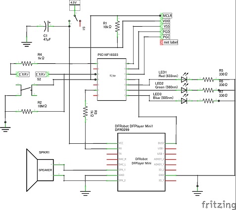 PICのMCLRに使用していたタクトスイッチは音楽停止ボタンに機能変更。