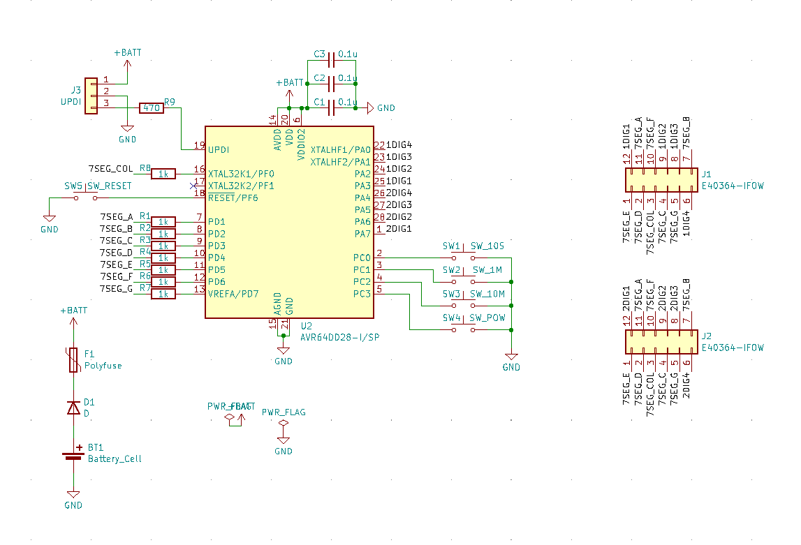 マイコンは、新しいAVR DD シリーズを使用しました。Atmega328pより安く、DIP型もあるため使いやすいです。電源は、ボタン電池を使用しました。基盤サイズを秋月C基盤と同じにしたかったので、フットプリントが小さい立てるタイプの電池ソケットにしました。