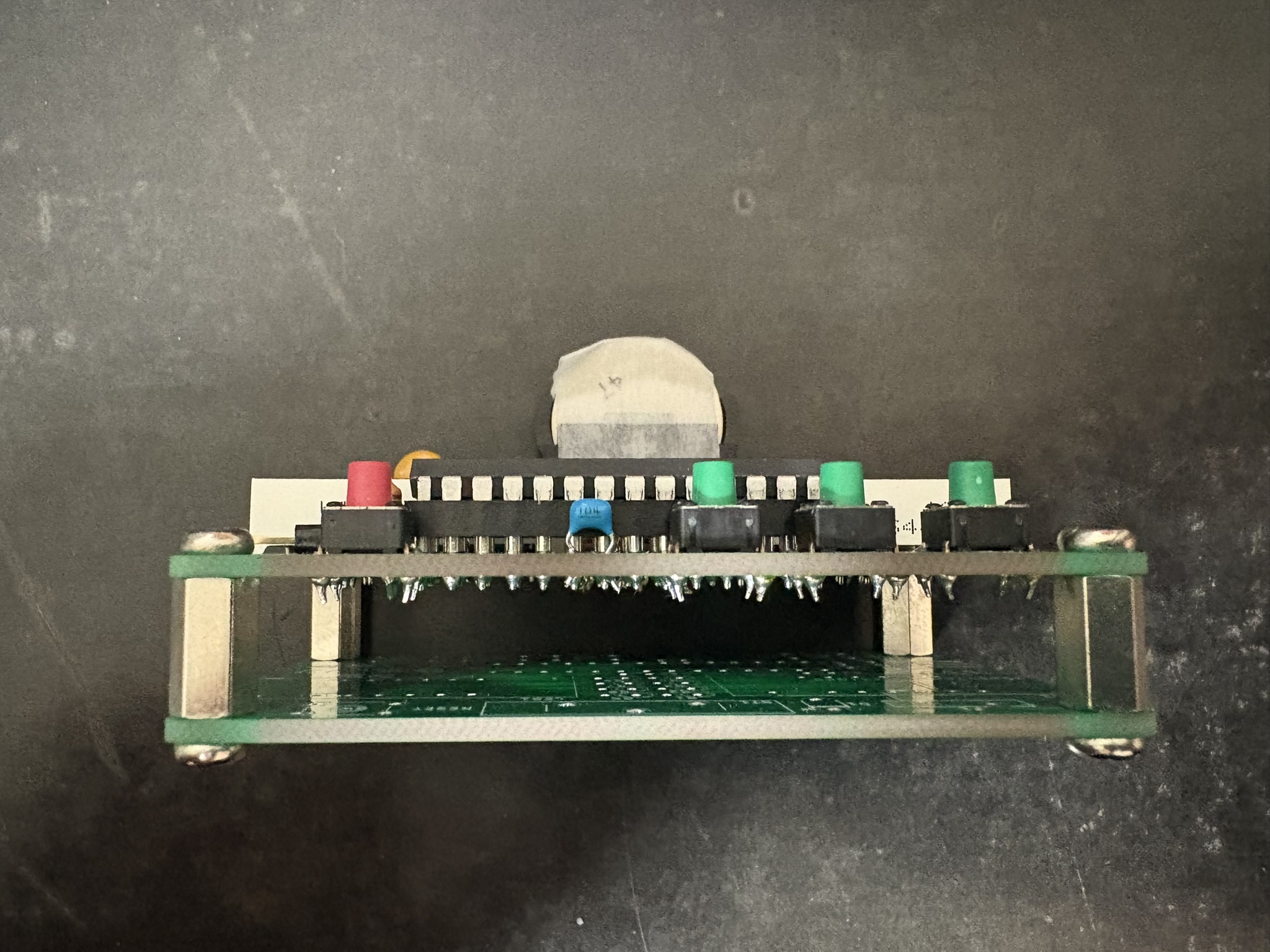 基板サイズは、秋月のC基盤と同じサイズにしました。基盤の発注は5枚からなので、いつも4枚余ります。私はいつも、同じ基盤をスペーサーで裏面に付けて、部品の足などが手や服に引っかからないようにしています。そうすることで、余りは3枚になりますが、3枚も余ります。基盤サイズを秋月のユニバーサル基板と同じサイズにすることで、ユニバーサル基板で作成した別プロジェクトの基盤の裏につけることができ、無駄なく使用できます。