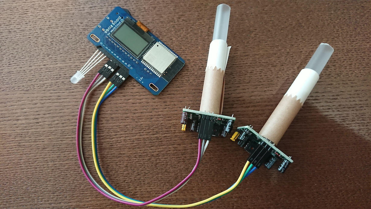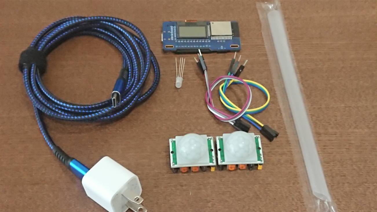 人が「出ていった」「入いってきた」を検出し、入ってきた場合は青色、出て行った場合は赤色にLEDを光らせるところまで。