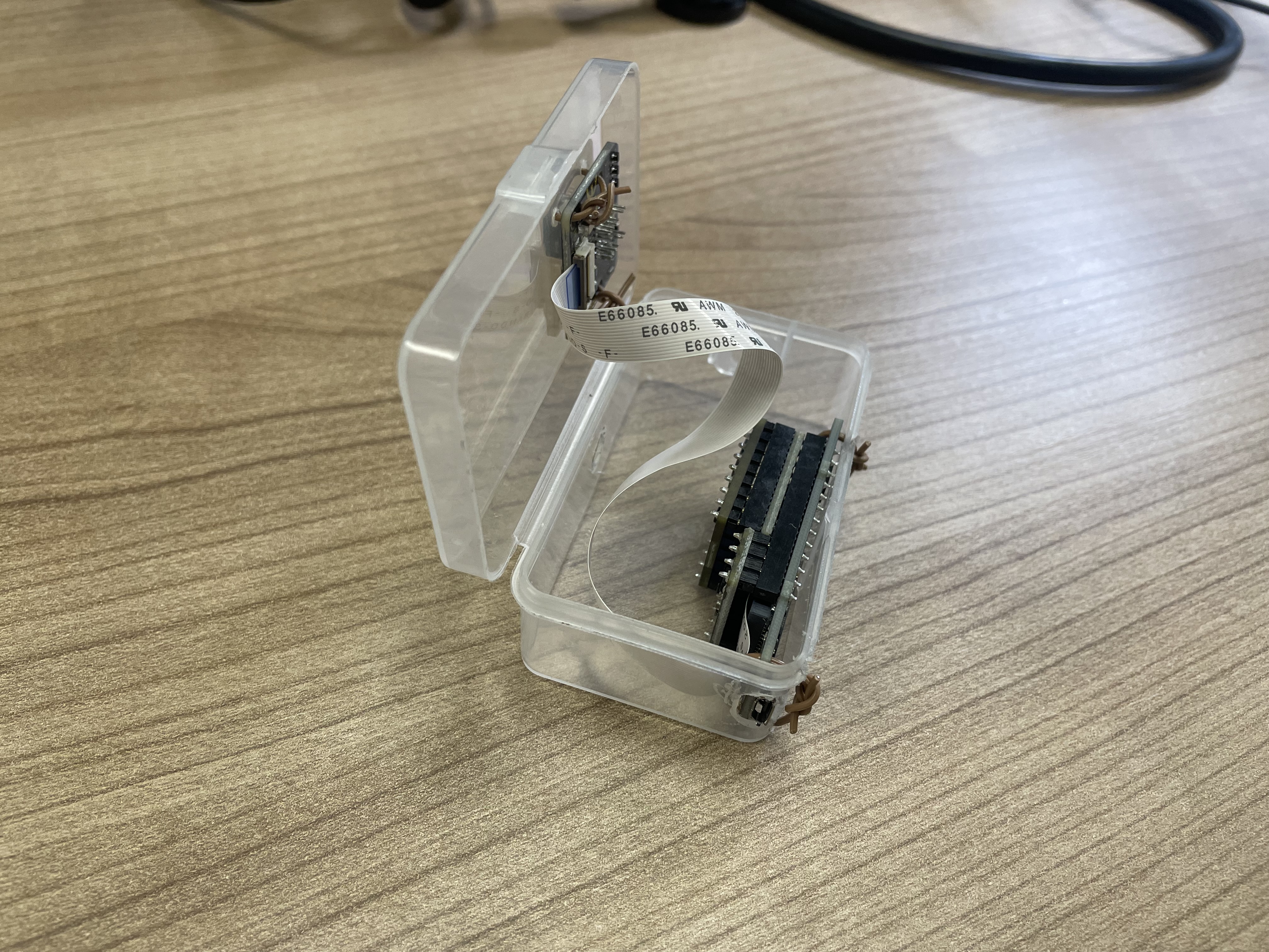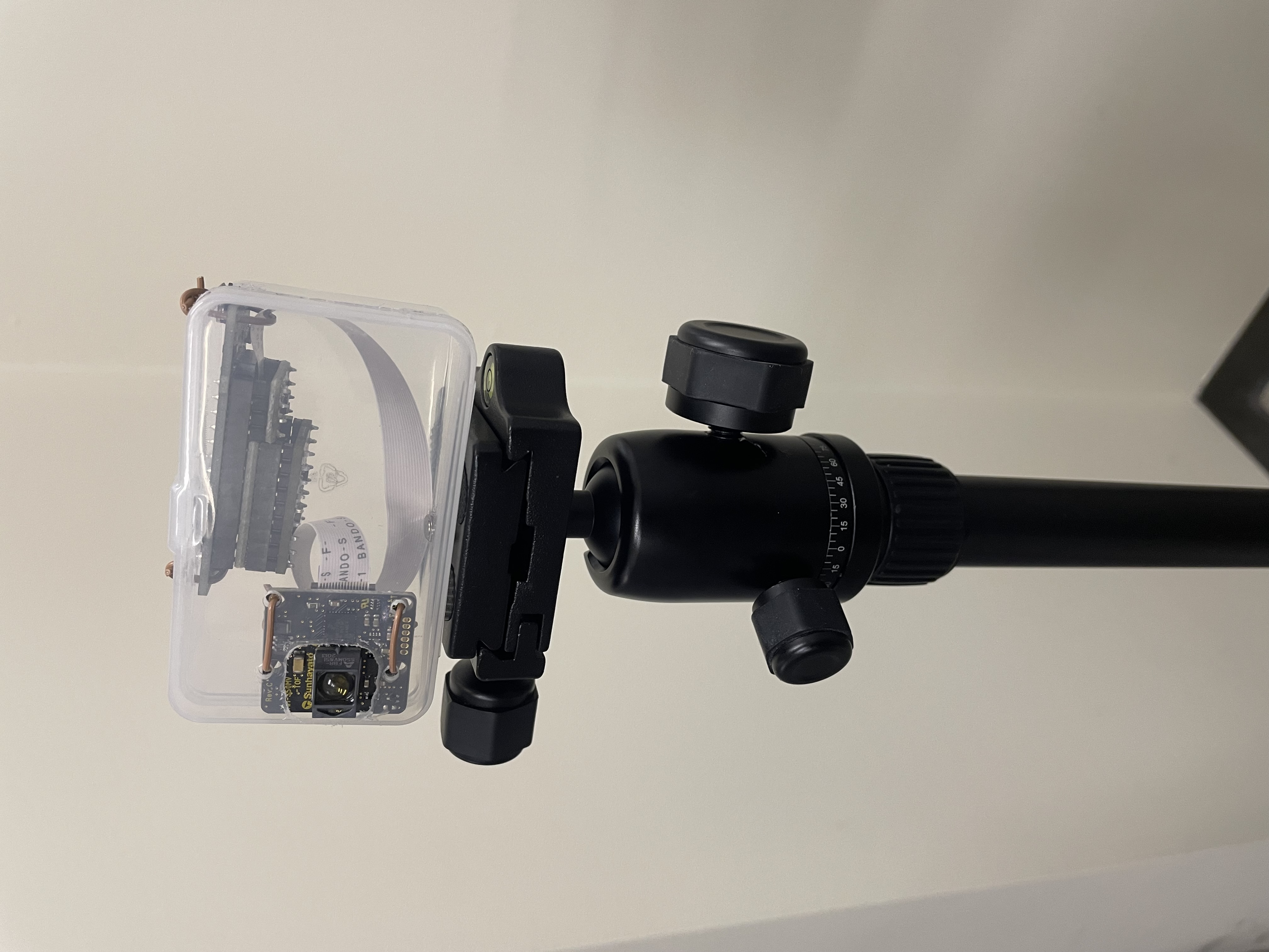 デバイス(箱)のサイズは幅70mm×奥行40mm×高さ30mm程度。電子部品が入っていた箱を利用し、穴あけ加工して使っています。カメラ三脚に設置(マウント)できる形状にしている。