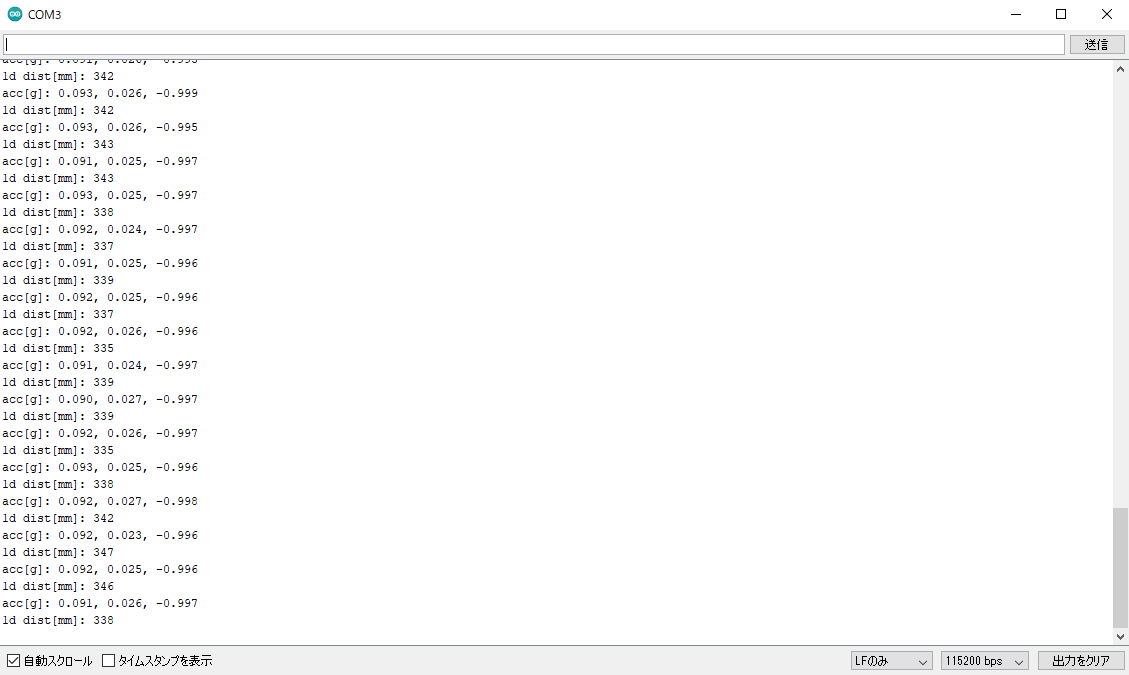 現在は距離1点、3軸の加速度のデータを取得し、シリアル出力している段階である。長い道のりであるが、以下のことを予定している。