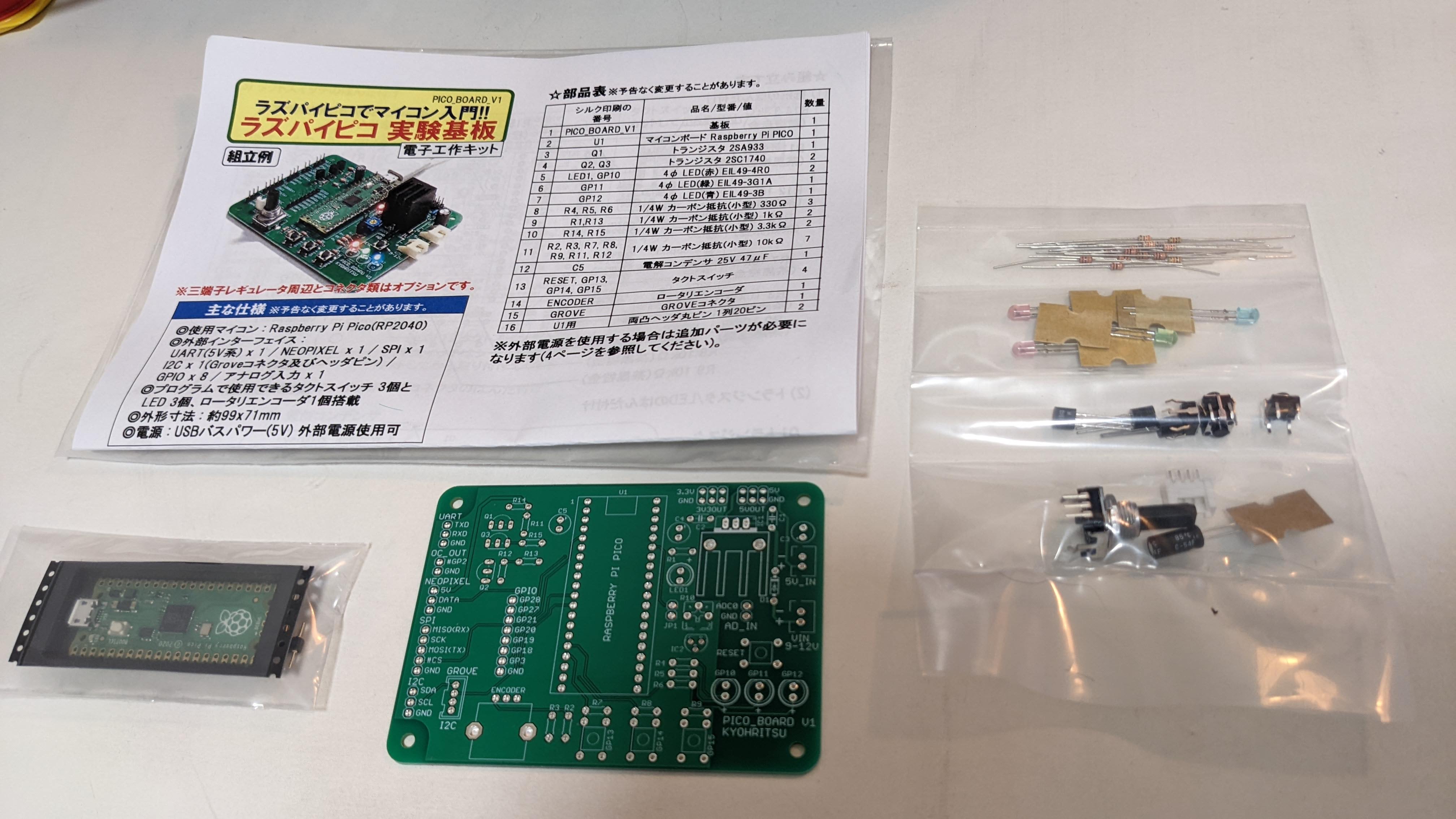 共立エレショップさんで発売されている、Raspberry Pi Pico(ラズパイピコ) を動かせる基板と部品のキットです。(ラズパイピコ本体付き)