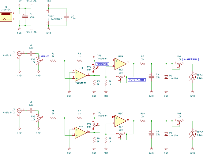 - クリップレベル調整: この回路では、ダイオードで大きい信号をGNDに落とすことでメータを保護している。そのため、これを調整して信号の最大値を決める。