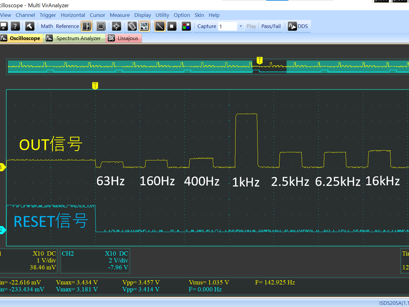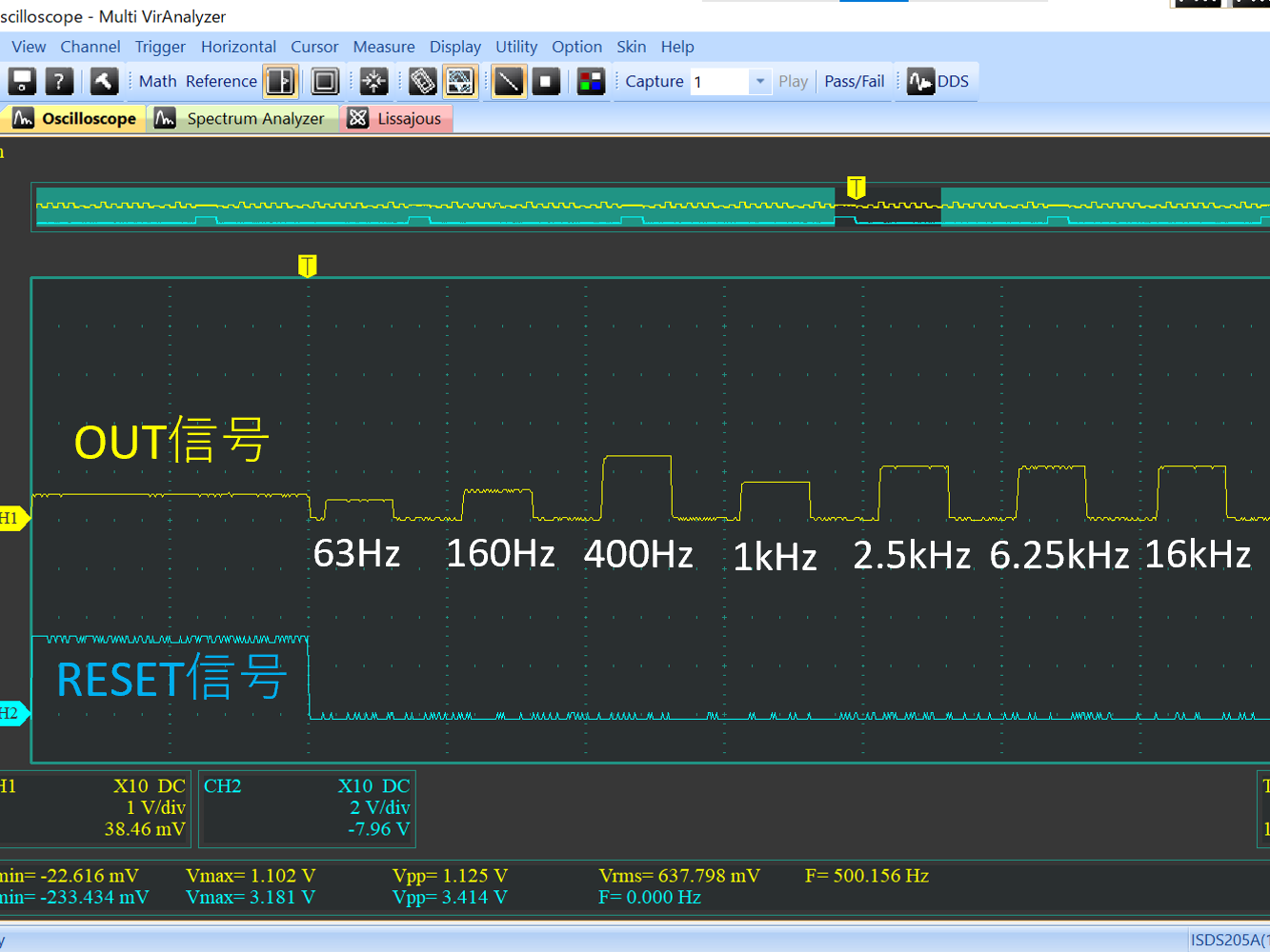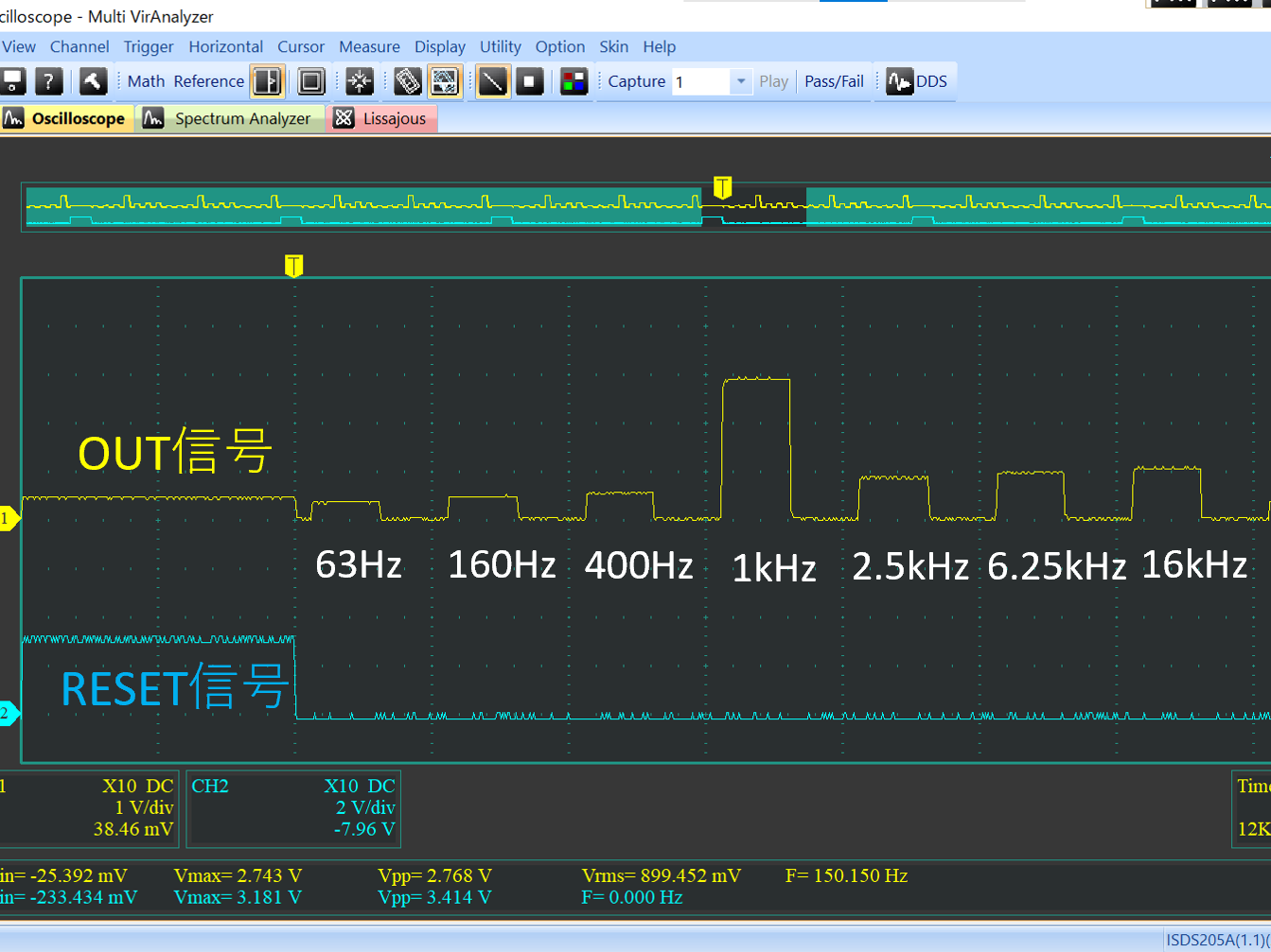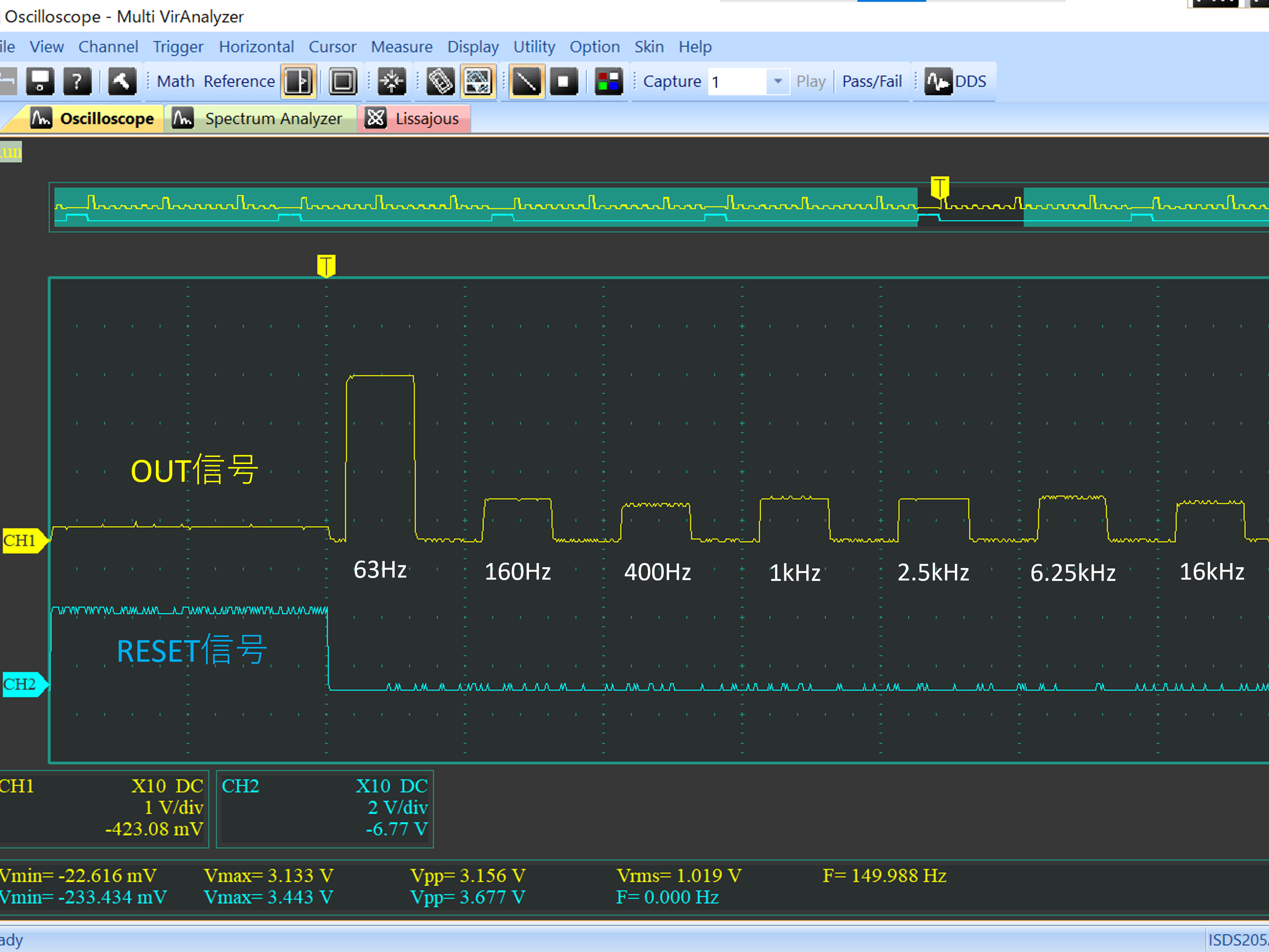 STROBE、および、RESETはDigital Discoveryに接続し、下図のような制御信号を送った。これにより、2入力のオシロスコープを用いて、RESET信号でトリガをかけてOUT端子を見ることで、各ピークの高さを安定的に測定できるようにした。