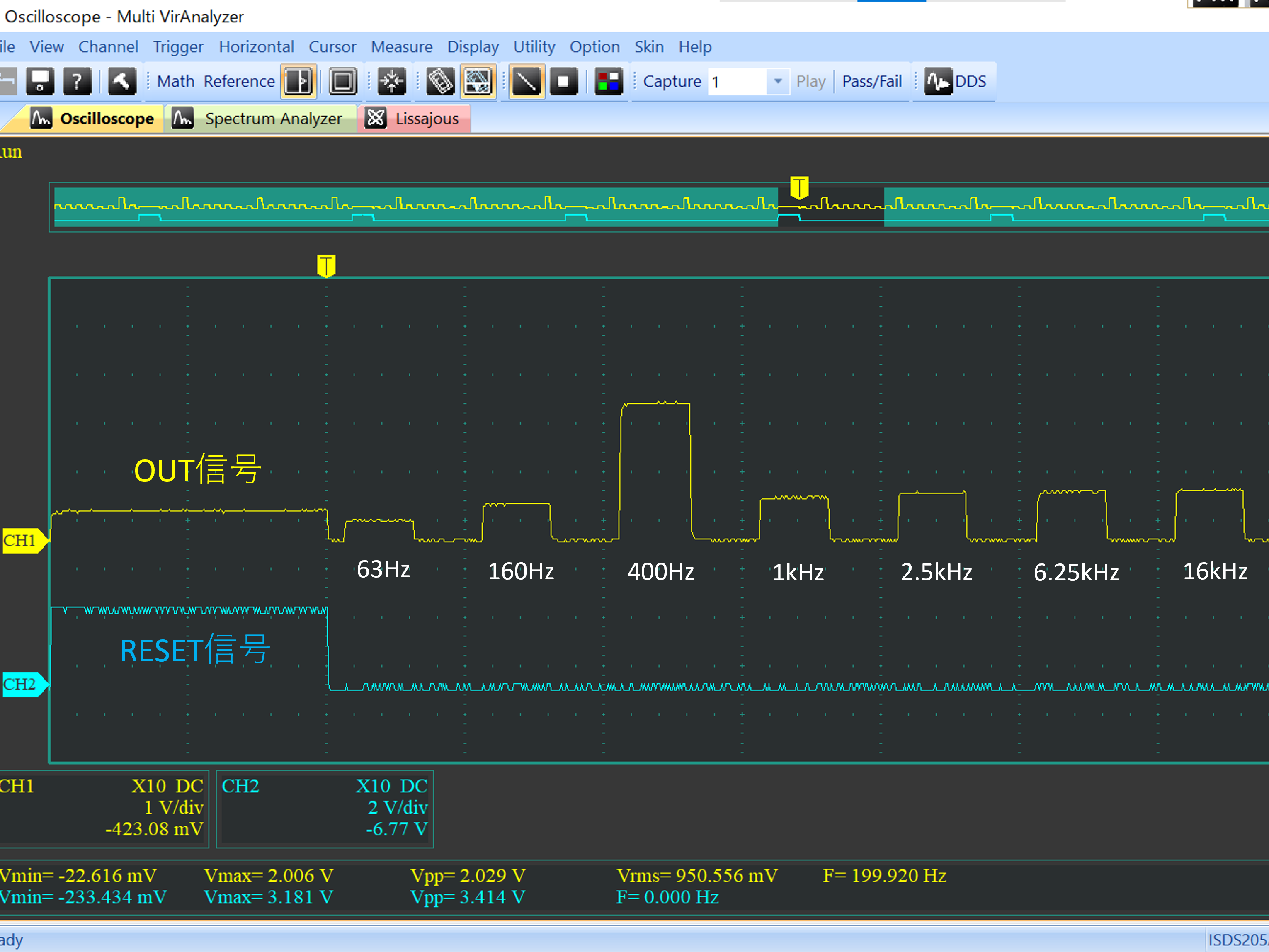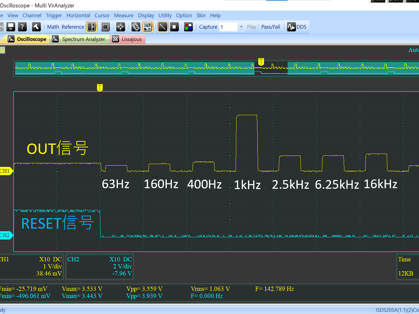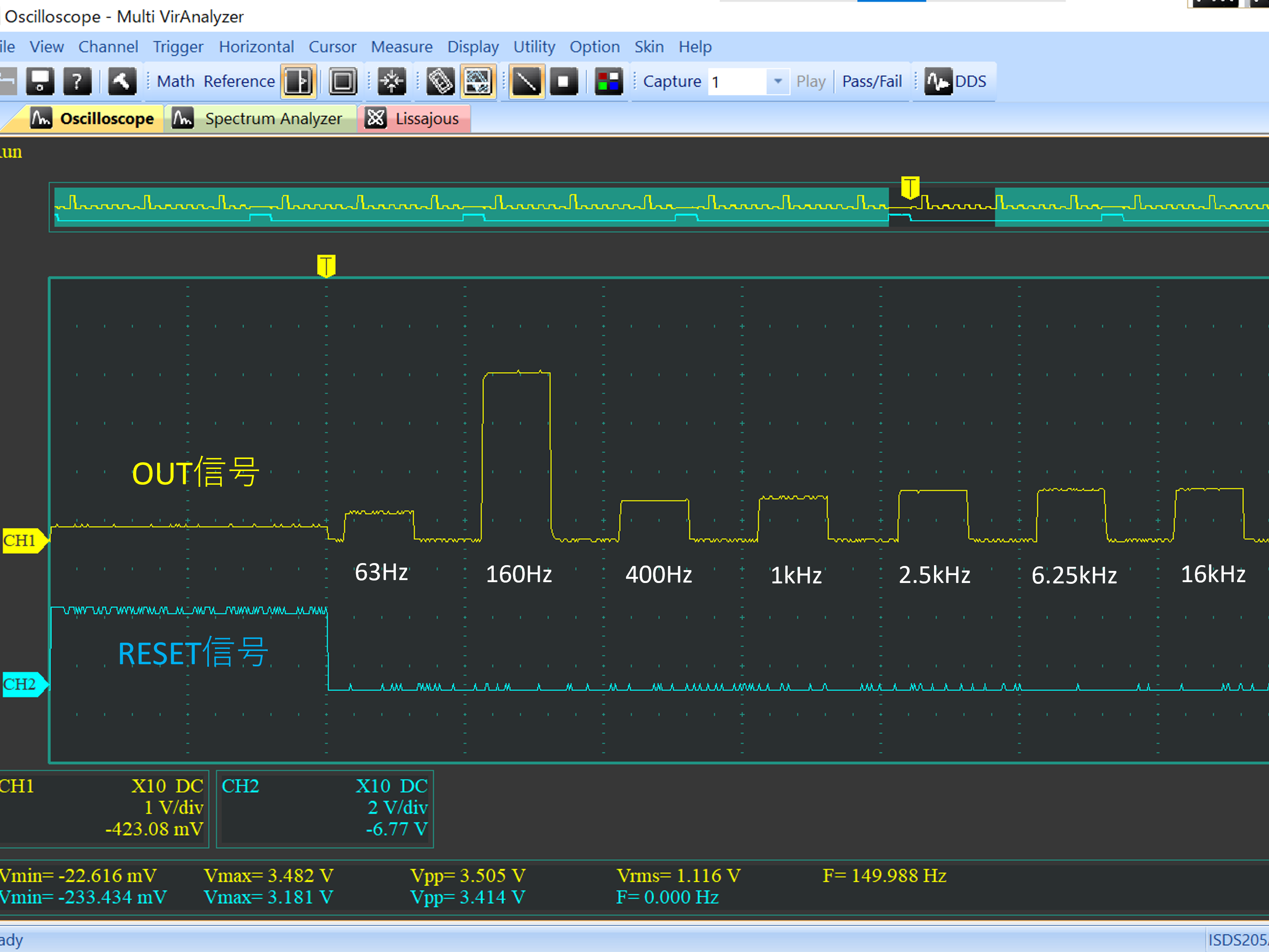 STROBE、および、RESETはDigital Discoveryに接続し、下図のような制御信号を送った。これにより、2入力のオシロスコープを用いて、RESET信号でトリガをかけてOUT端子を見ることで、各ピークの高さを安定的に測定できるようにした。