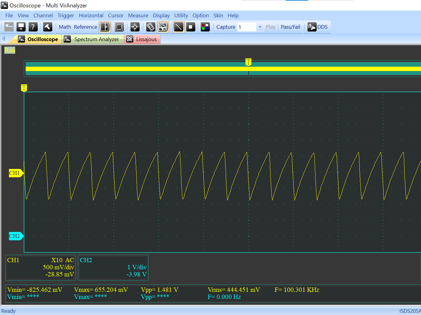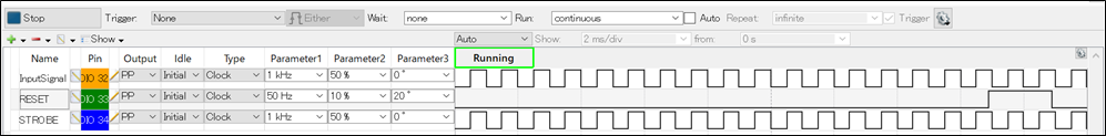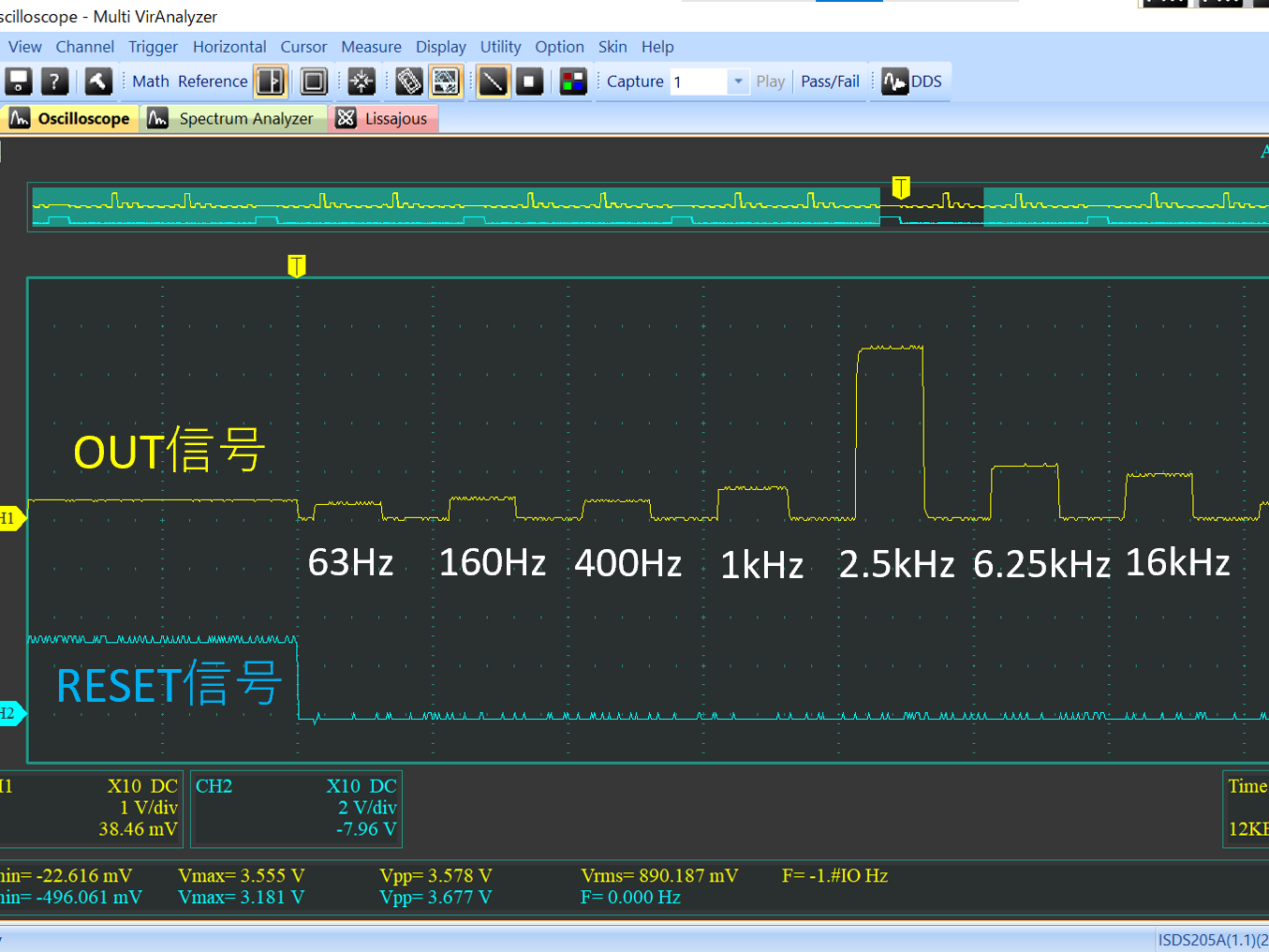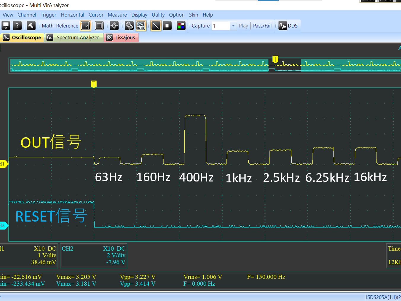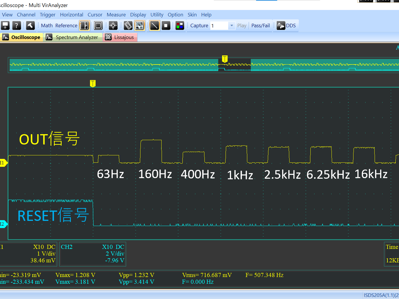 STROBE、および、RESETはDigital Discoveryに接続し、下図のような制御信号を送った。これにより、2入力のオシロスコープを用いて、RESET信号でトリガをかけてOUT端子を見ることで、各ピークの高さを安定的に測定できるようにした。