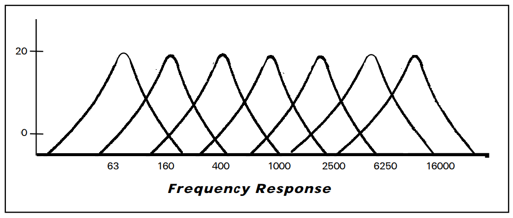 MSGEQ7は入力信号のスペクトルを7バンドに分割し、それぞれの周波数領域における周波数成分を出力することができる。出力される周波数成分は下図のように、入力信号に63Hz, 160Hz, 400Hz, 1kHz, 2.5kHz, 6.25kHz, 16kHzの成分が含まれるとき、それぞれの周波数に対応する出力電圧が高くなり、出力電圧の高低により、入力電圧のスペクトル、つまり、入力に含まれる周波数成分の高低を知ることができる。
