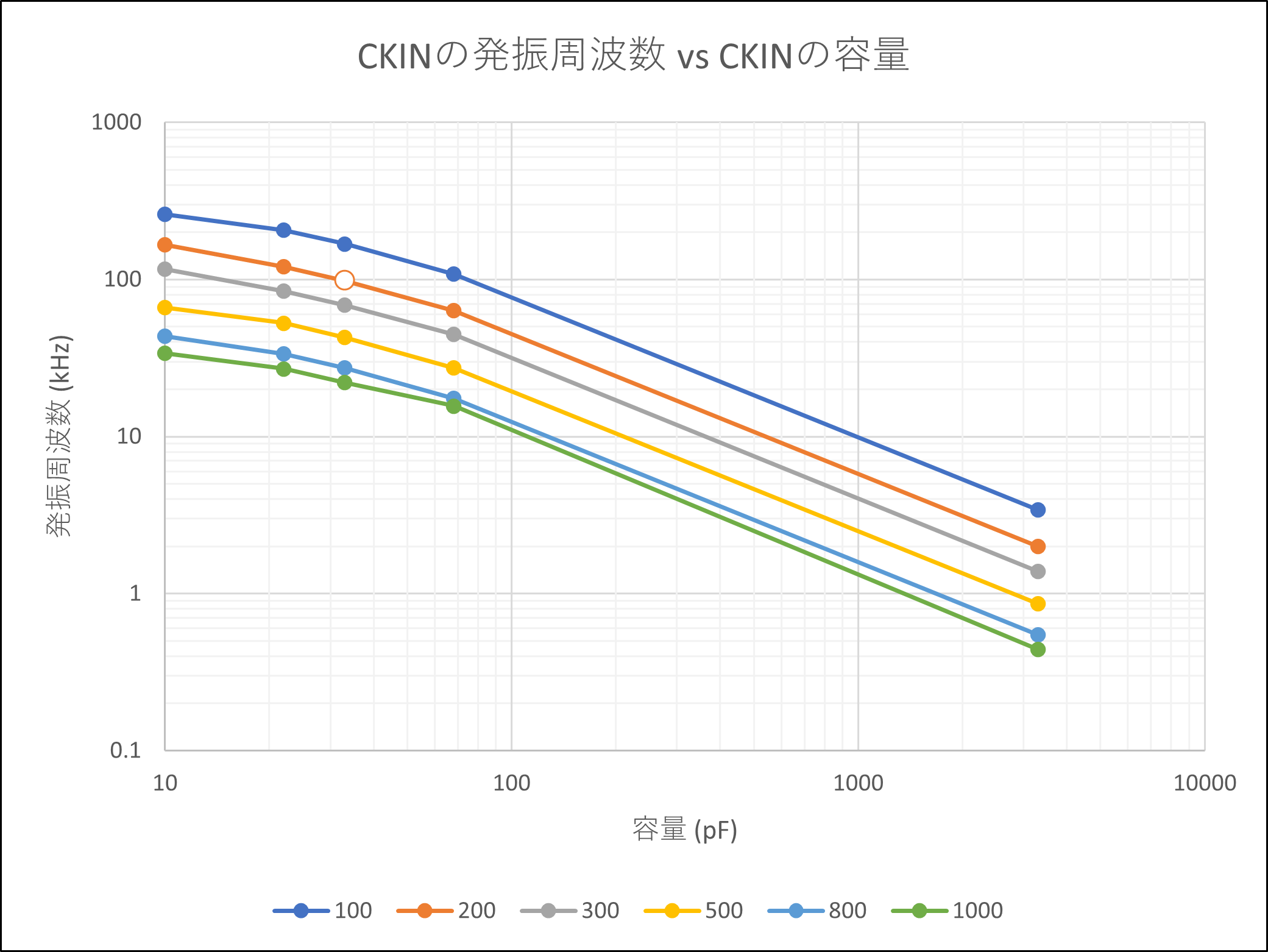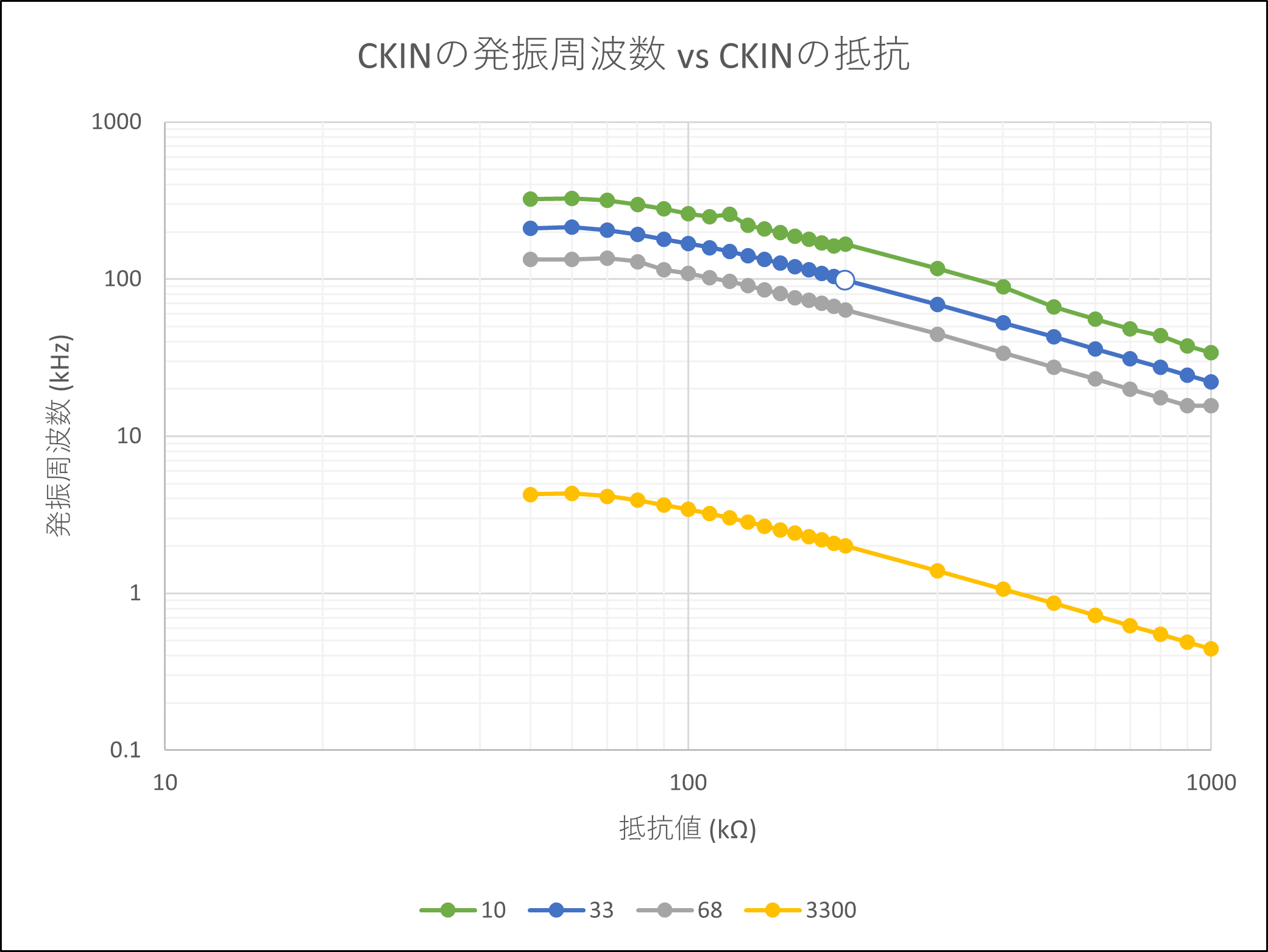 以下では、CKINに接続する抵抗とコンデンサの値を変更してCKINの発振周波数を調べ、この仮説が正しいかどうかを検証する。