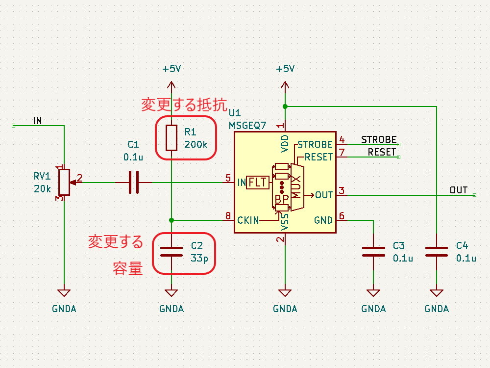 前節でCKINに接続する抵抗に比例して出力に表示されるピーク周波数が変わり、それに応じてスペクトルの形状が変わることを確認した。この変化は偶然の産物なのだろうか?前節の結果が偶然ではなく、回路動作上妥当な特性変化であることが確認できるのであれば、MSGEQ7は推奨回路から外付け部品を変更することで、特性を自由に変えて動作させることができると言える。