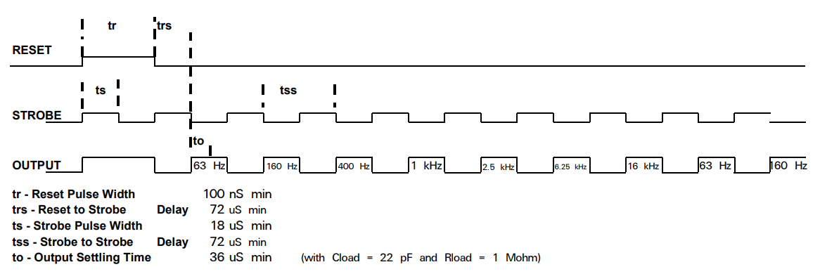 実際のICの出力は、制御信号であるSTROBEとRESETによって、OUT端子に出力する周波数成分の周波数を切り替えることで行う(下図)。例えば、Ardiuno等のマイコンに接続して使用する場合、マイコンの出力ポートでSTROBE信号を発生させながらOUT端子の電圧を読み取っていくことで、連続的にスペクトルを読み込むことができる。