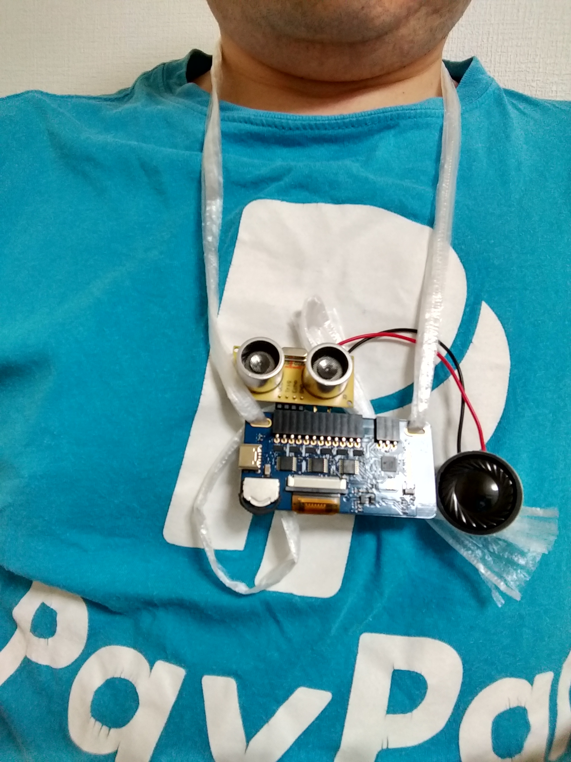 写真のように首から下げます。モバイルバッテリーはUSB-TypeCケーブルを伸ばしてポケットにでも入れておいてください。