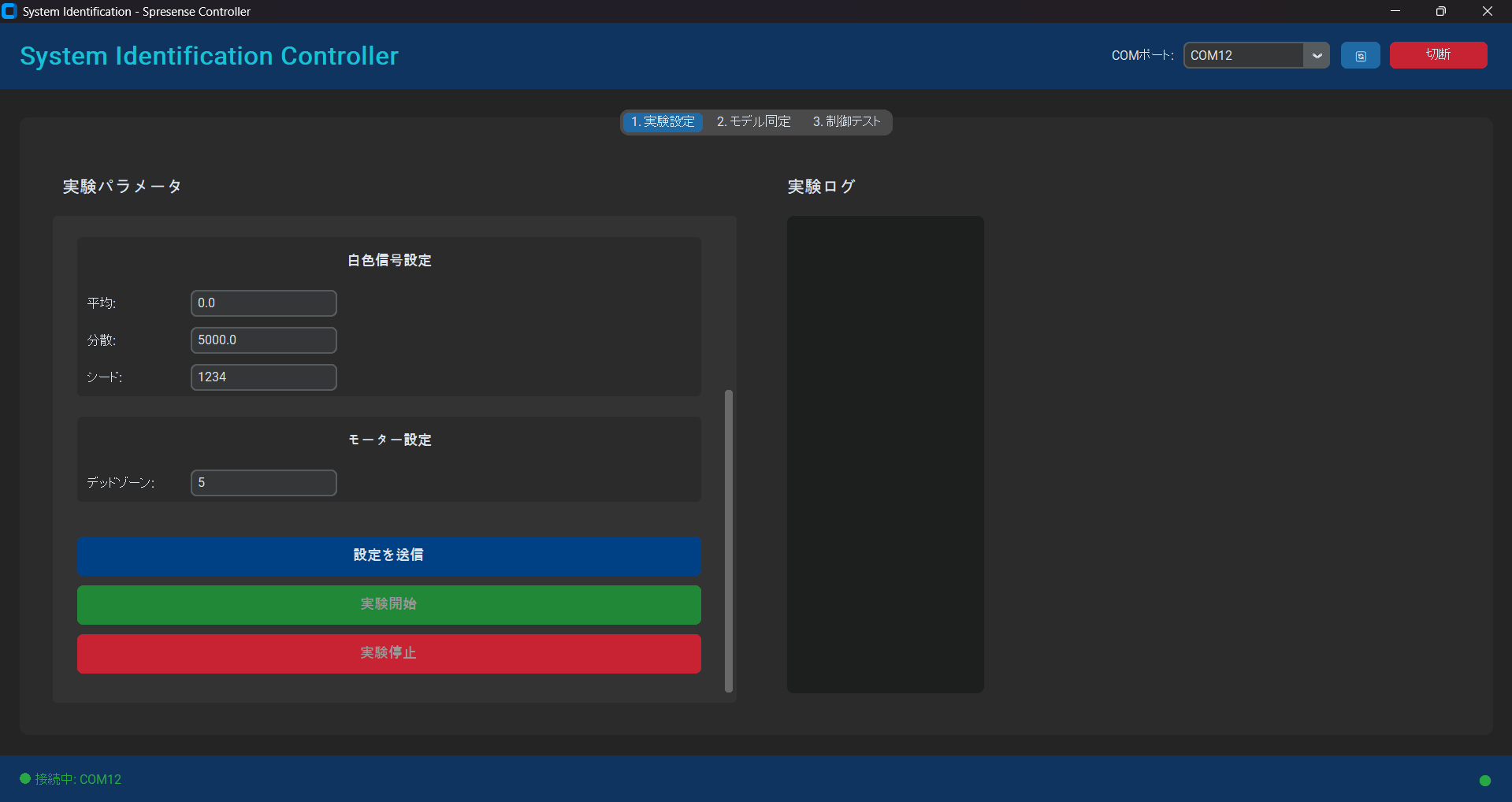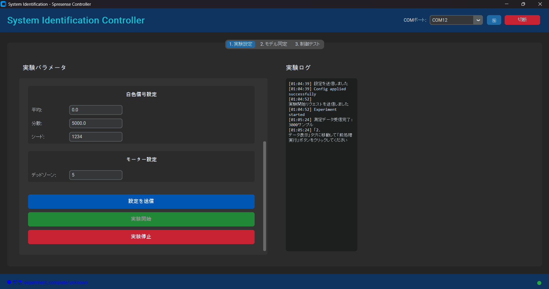 このボタンを押すことでSpresenseに設定を送信し、Spresense側で内容が確認された場合、実験の開始ボタンを押すことができるようになり、実験開始ボタンを押すことで実験が開始されます。