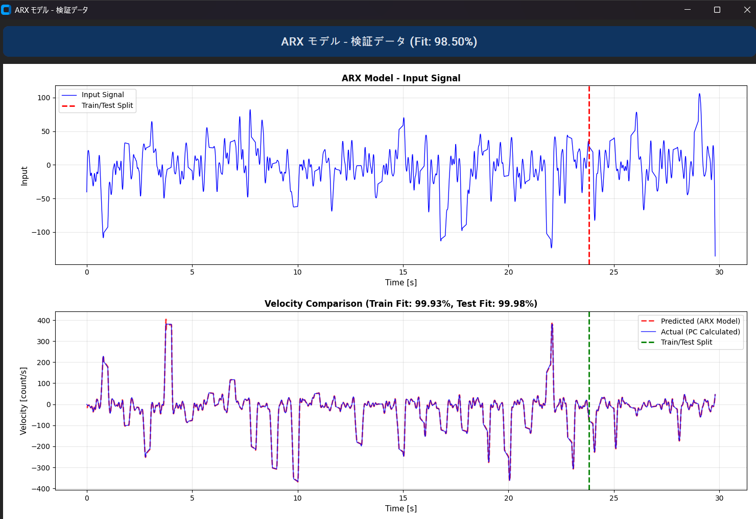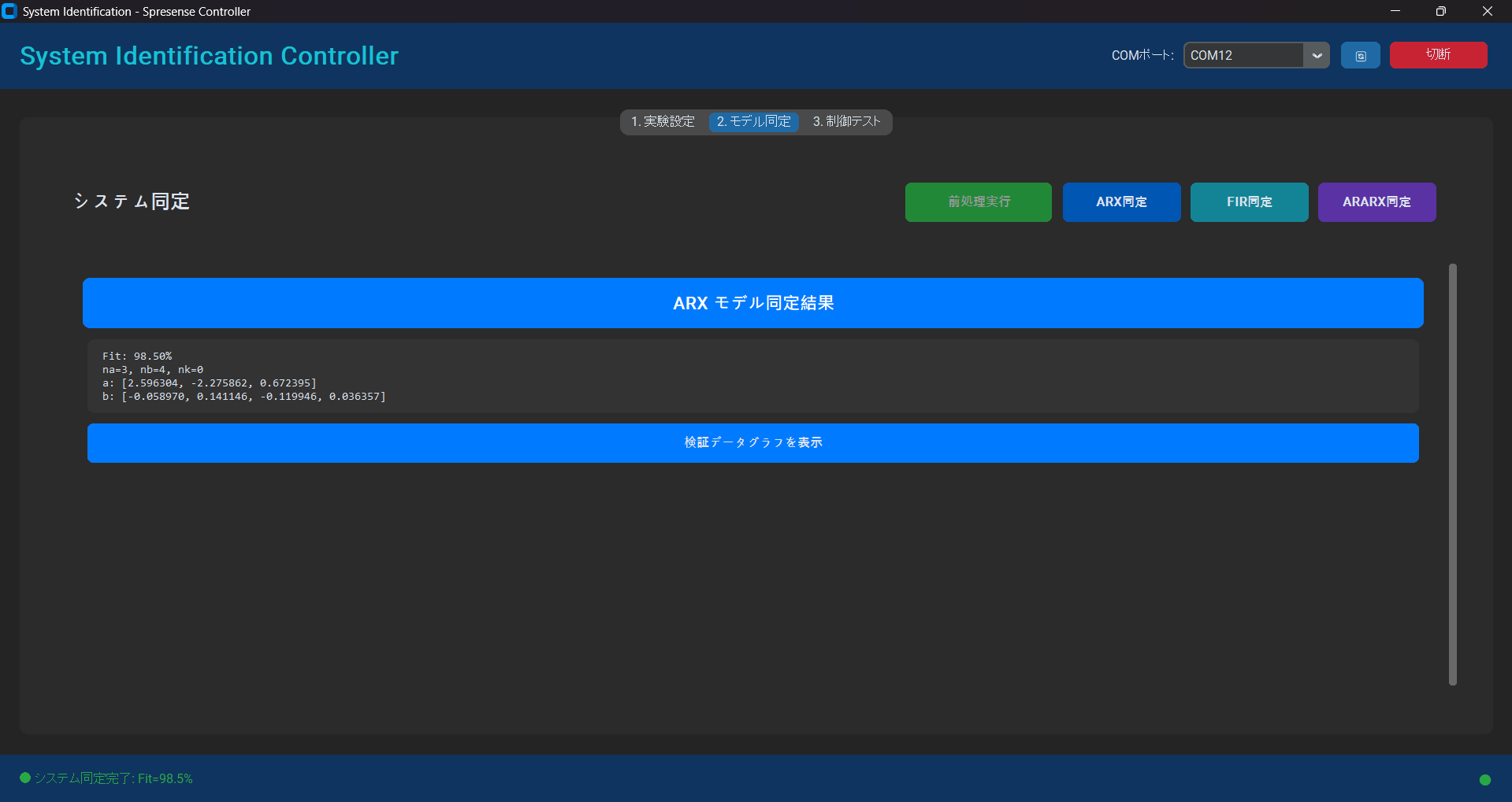 前処理ボタンを押した後、所望のモデルのボタンを押すことでシステム同定が実行されます。以下はARXモデルのボタンを押したときの画面です。