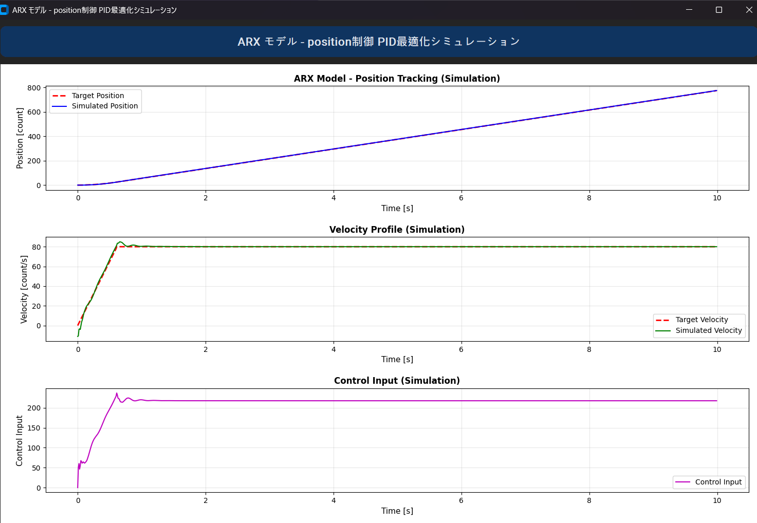 位置制御のPIDパラメーターを最適化した結果以下のようになりました。