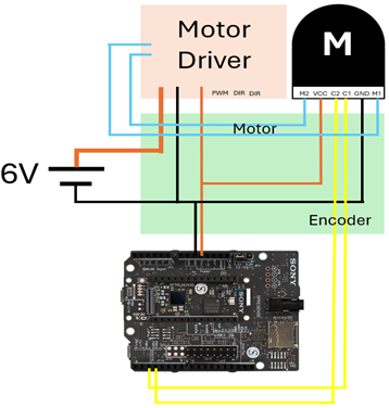 Spresense(C++/Arduino): モーターのPWM駆動、エンコーダーの高速サンプリング、およびリアルタイムな制御ループの実行を担当。