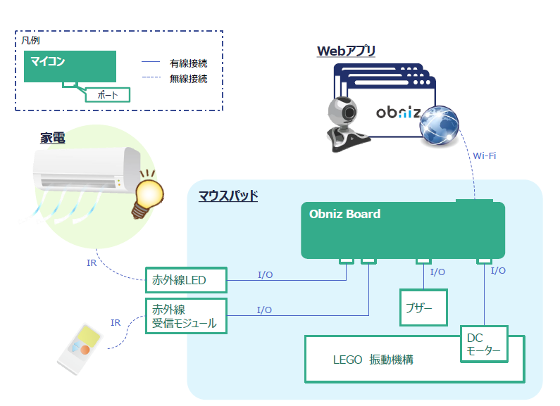 寝ていることを検知したらWi-Fi経由でマウスパッドに搭載されたObnizに指令が送られ、目覚ましアクションが発生する。