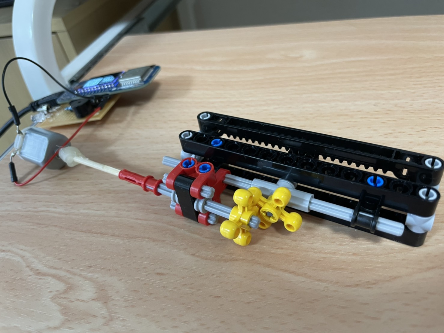 DCモーターを正逆交互に回転させ、レゴブロックで作ったラック・アンド・ピニオンを動作させる。