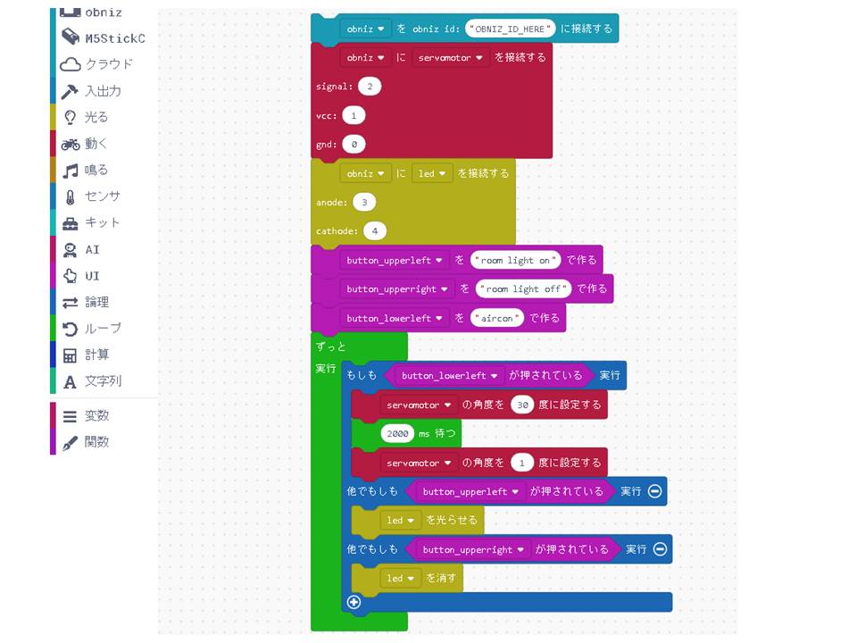 var obniz, servomotor, led, button_upperleft, button_upperright, button_lowerleft;