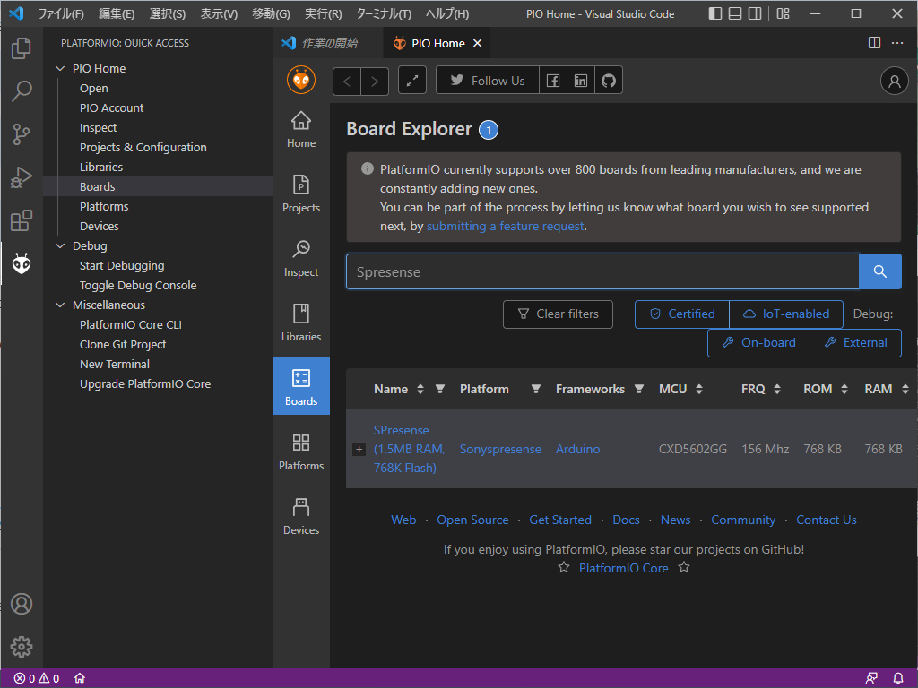 初期状態ではSpresenseは登録されていないので有志が作成したものを使用します.