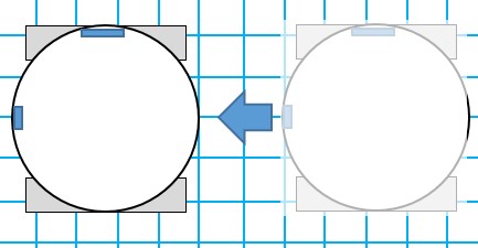 - 途中壁の角が右手にあたるが距離が比較的短いために回転をつづけ無事 90°回転を終わる