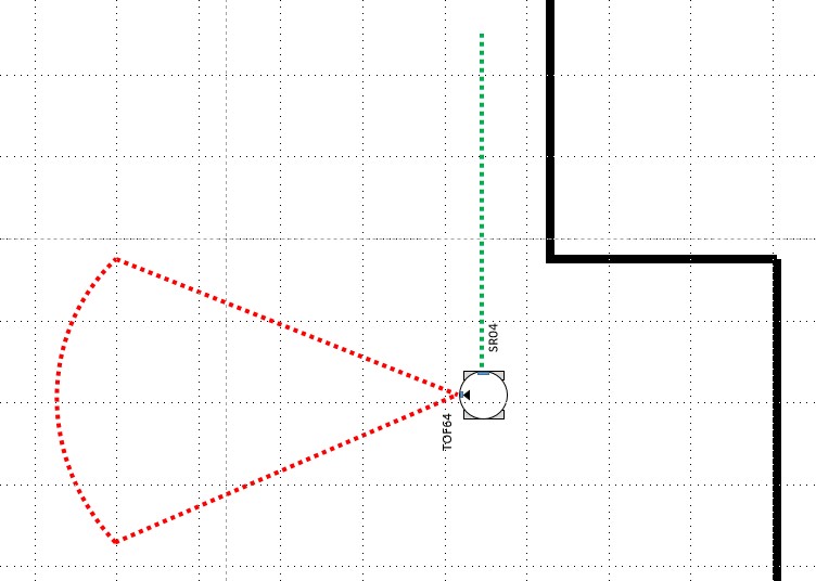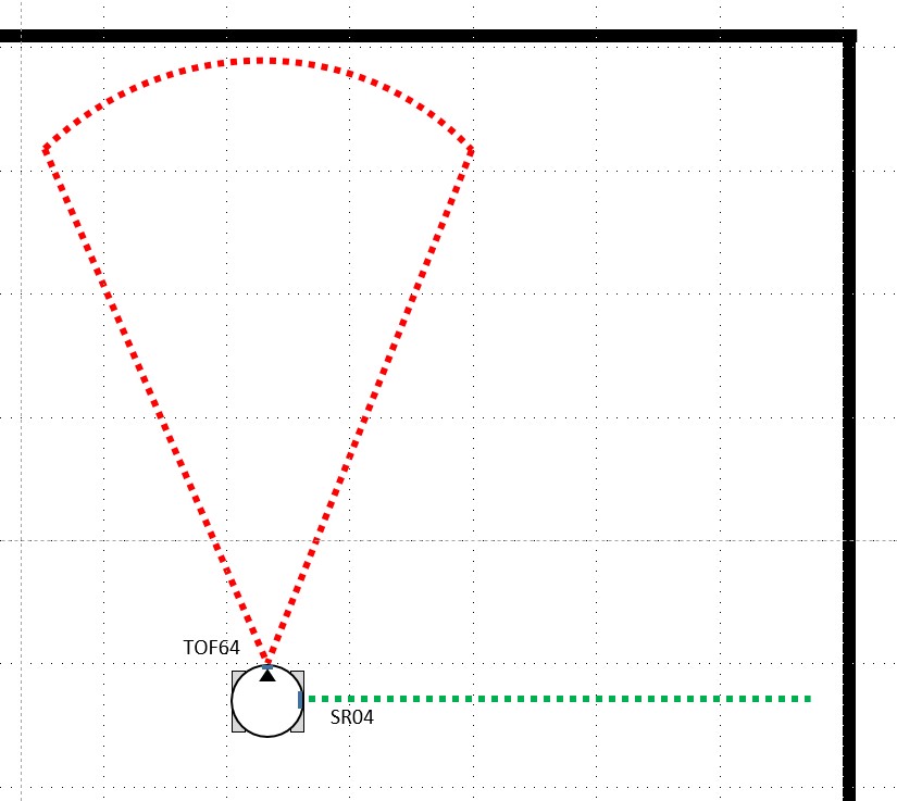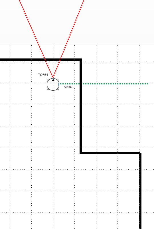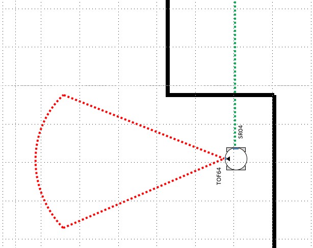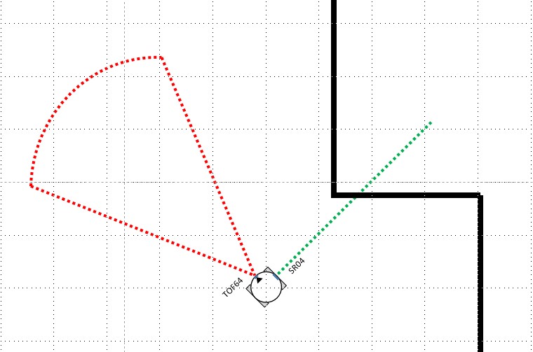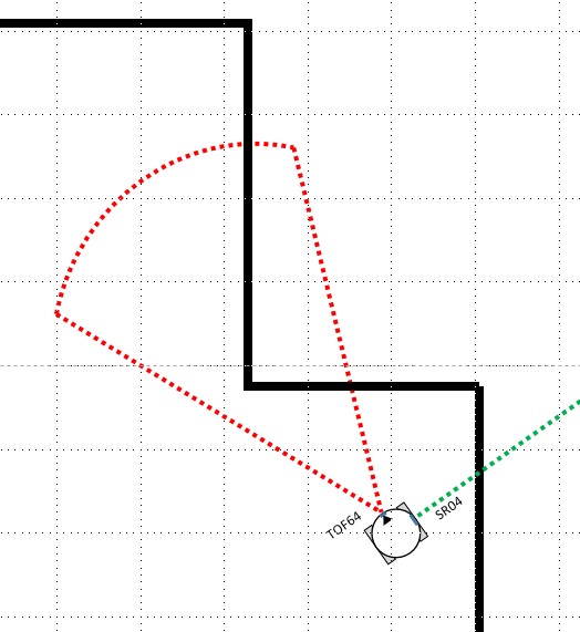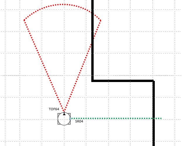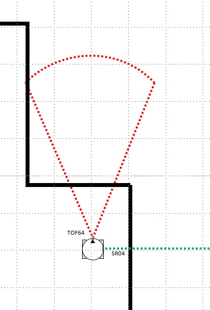 今回のTOF64センサは前方を見て壁の有無を45°のFOV で検出し、SR-04 は右手法アルゴリズムの右手の役目をします。