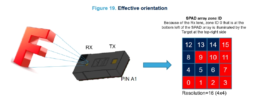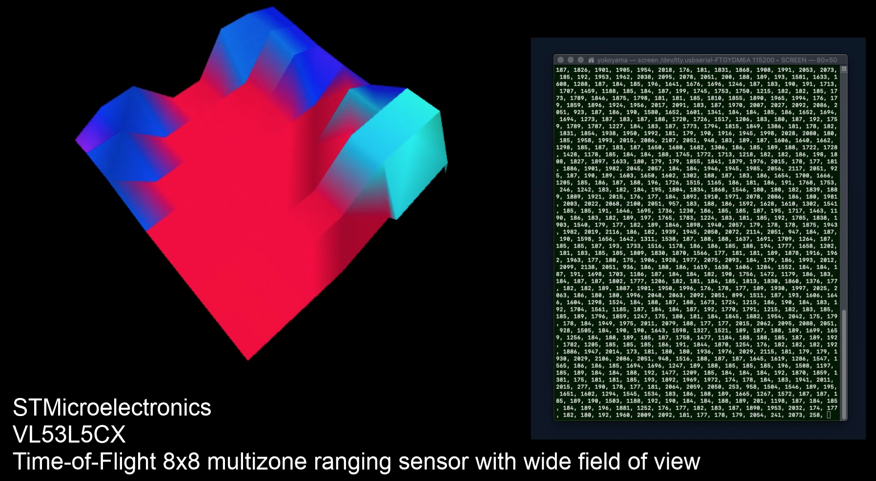 簡単に言うと TOFセンサ(Time Of Flight方式の光学式測距)が 8x8 の格子状に並べられていて