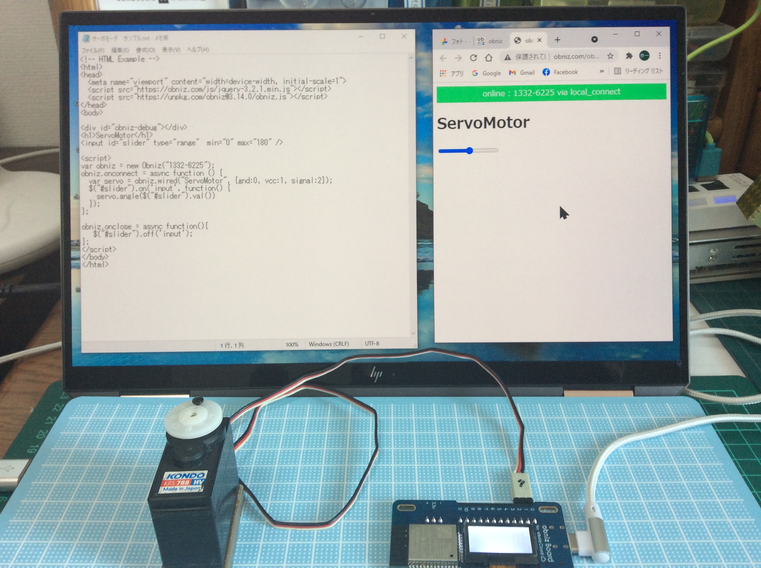 はじめに、obunizでサーボモーターを動かすプログラムのテストを行います。