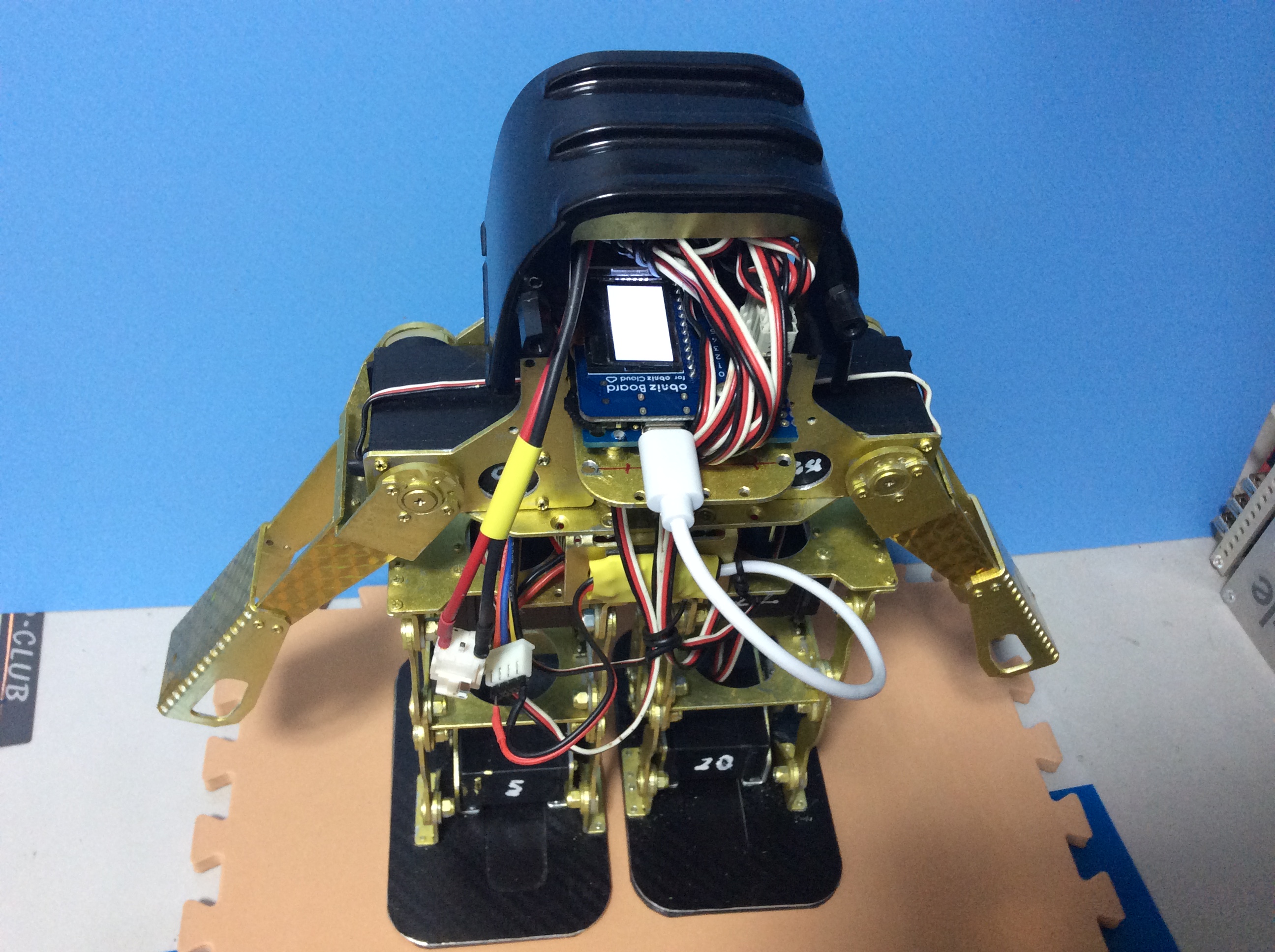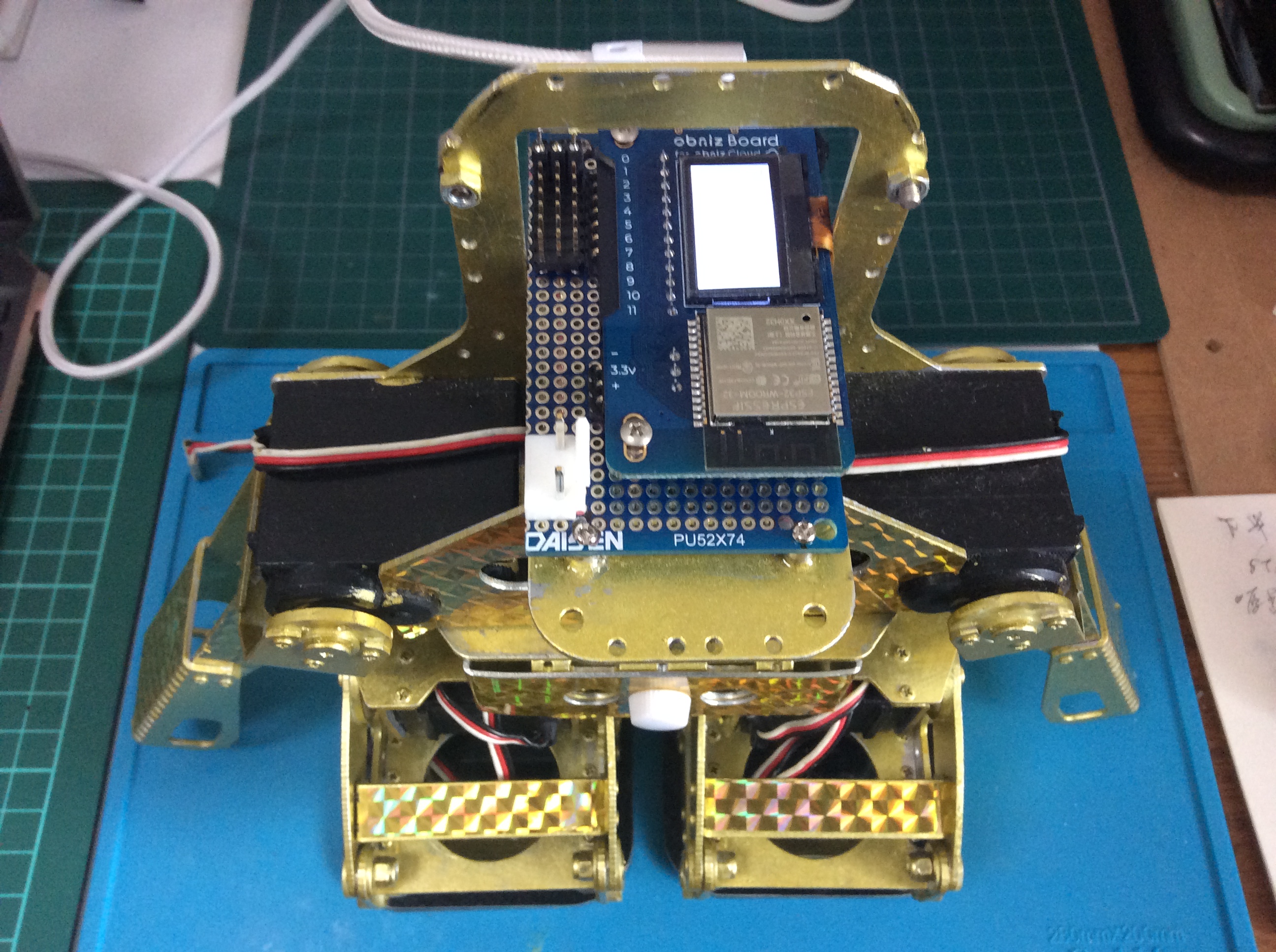 obnizBoardとJavaScriptで作った、二足歩行ロボット「オブちゃん」をよちよち歩きですが、歩かせる事までたどり着きました。