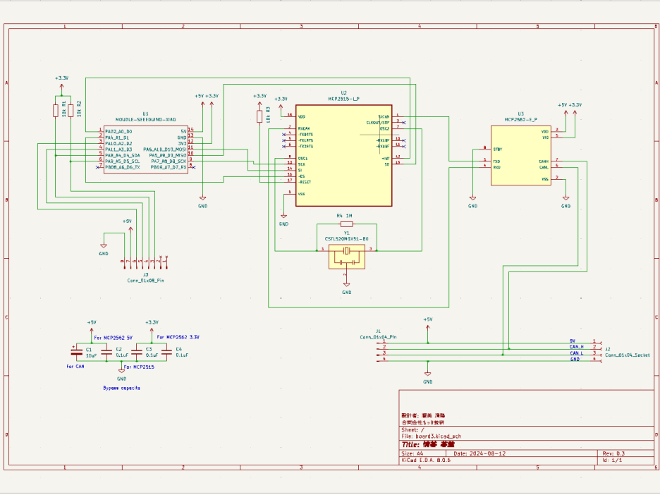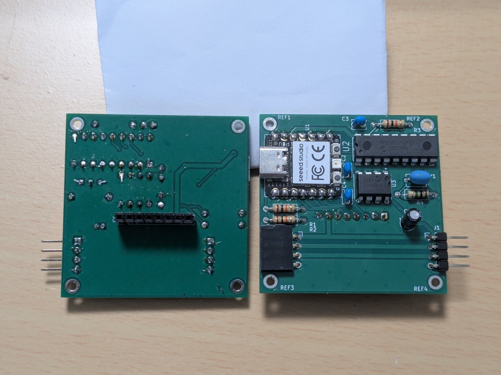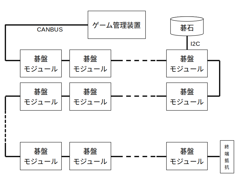 最後のCANは各碁盤モジュールへの個別通信と同報通信の両方を満たすプロトコルがCANコントローラに実装されています。RP2040への負荷が軽く、同期性の問題が生じる可能性が最も少ないと判断して採用しました。各碁盤モジュールにCANコントローラのMCP2515を実装するため単価は高くなりますが、今後XIAO RP2040の代わりにXIAO RA4M1を採用することで、CANコントローラを省略できコストも低減できる見込みです。