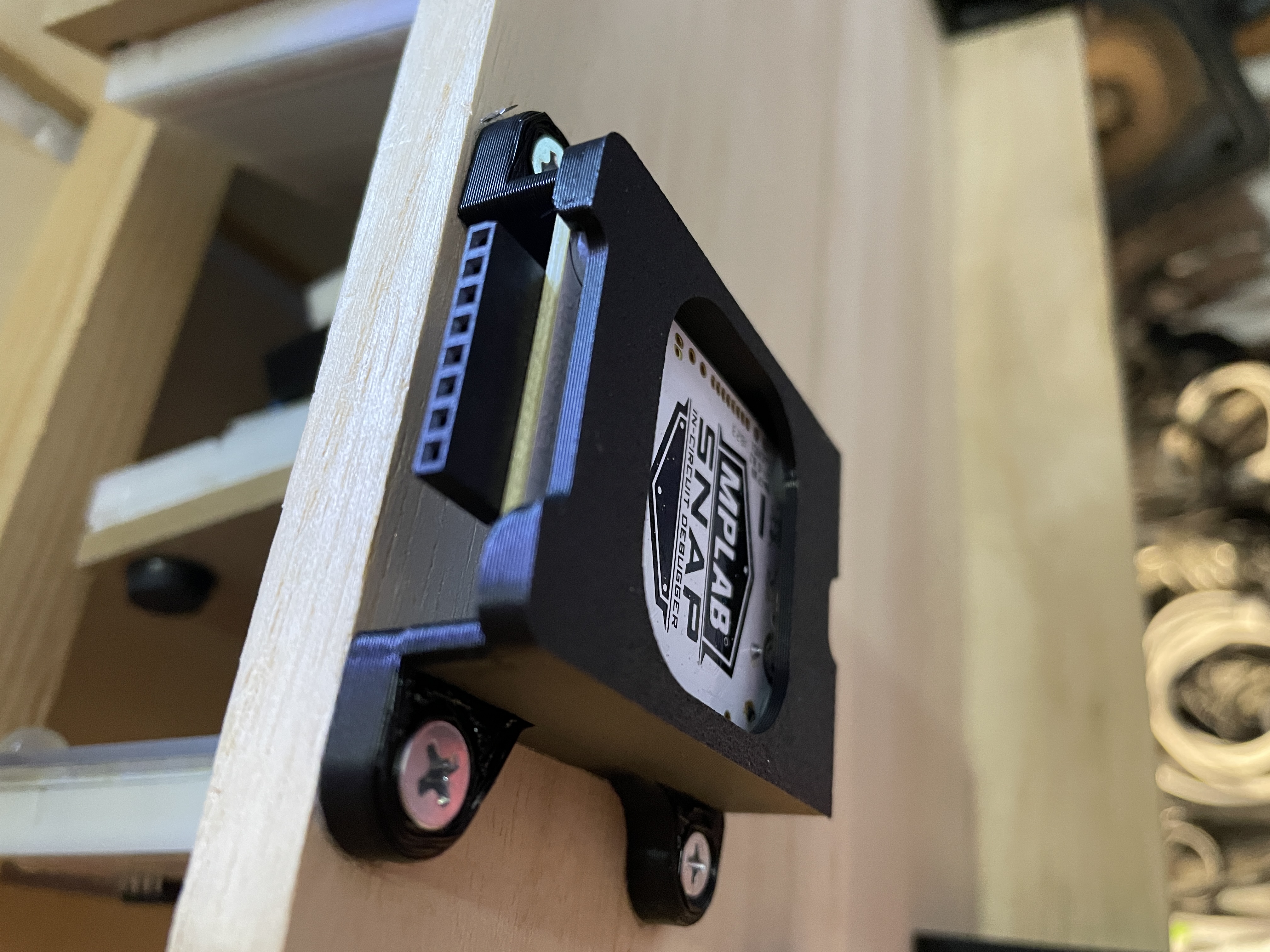 SNAPはターゲット用電源が供給されるように改造してみた。3.3Vと5Vは手動で差し替える。SNAPが小さすぎていつもどこかに紛れてしまうので、いつもの収納場所も3Dプリンタで作ってみた。(写真が自動で見切れてしまうw)