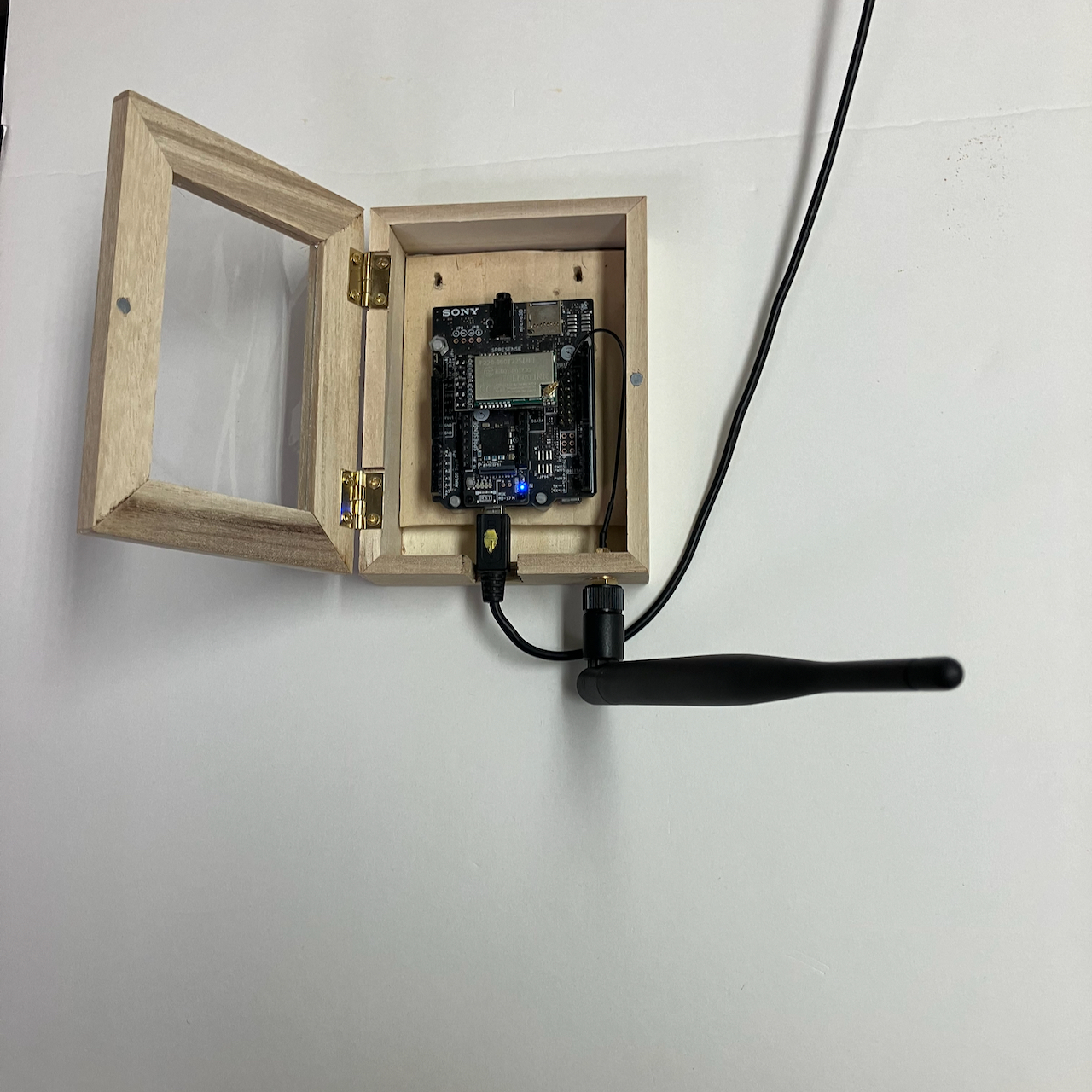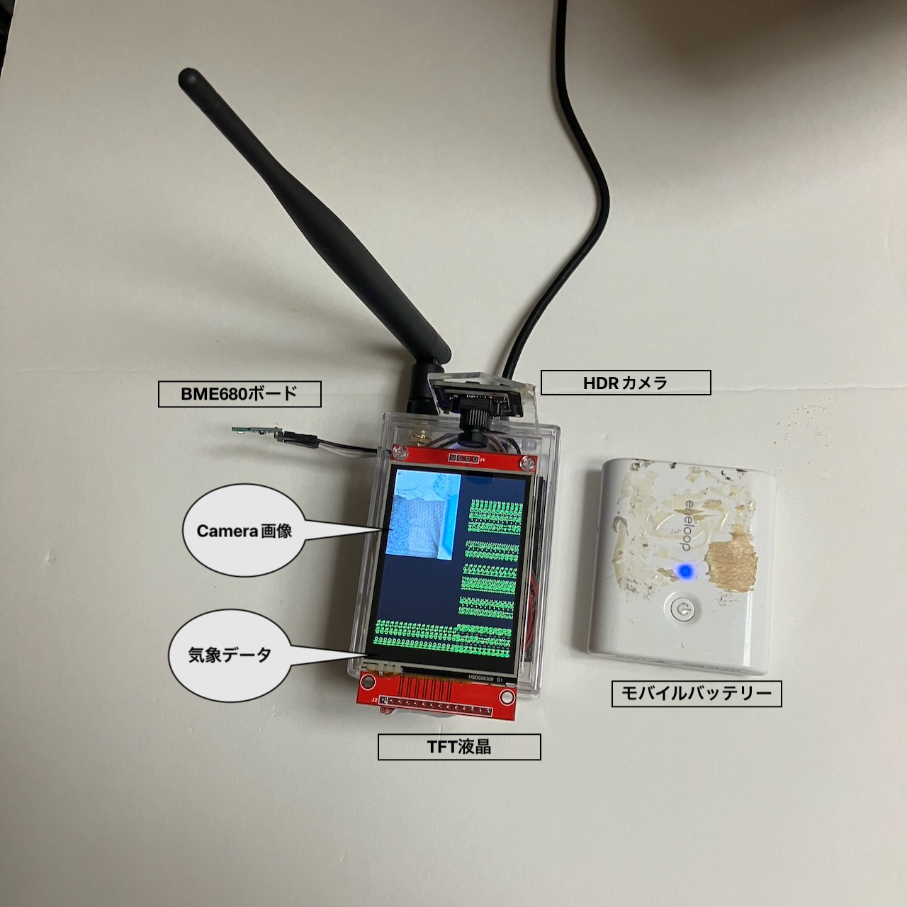 外部で単独で動作できるように、ケースに組み込みました。また、USBバッテリーで駆動しています。ただ、まだまだ防水の点などの考慮が不足です。また、省電力の努力は全くしておりません。それでも2日ほどの連続稼働は充分可能でした。