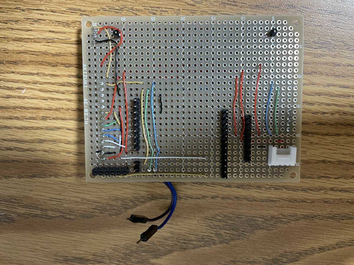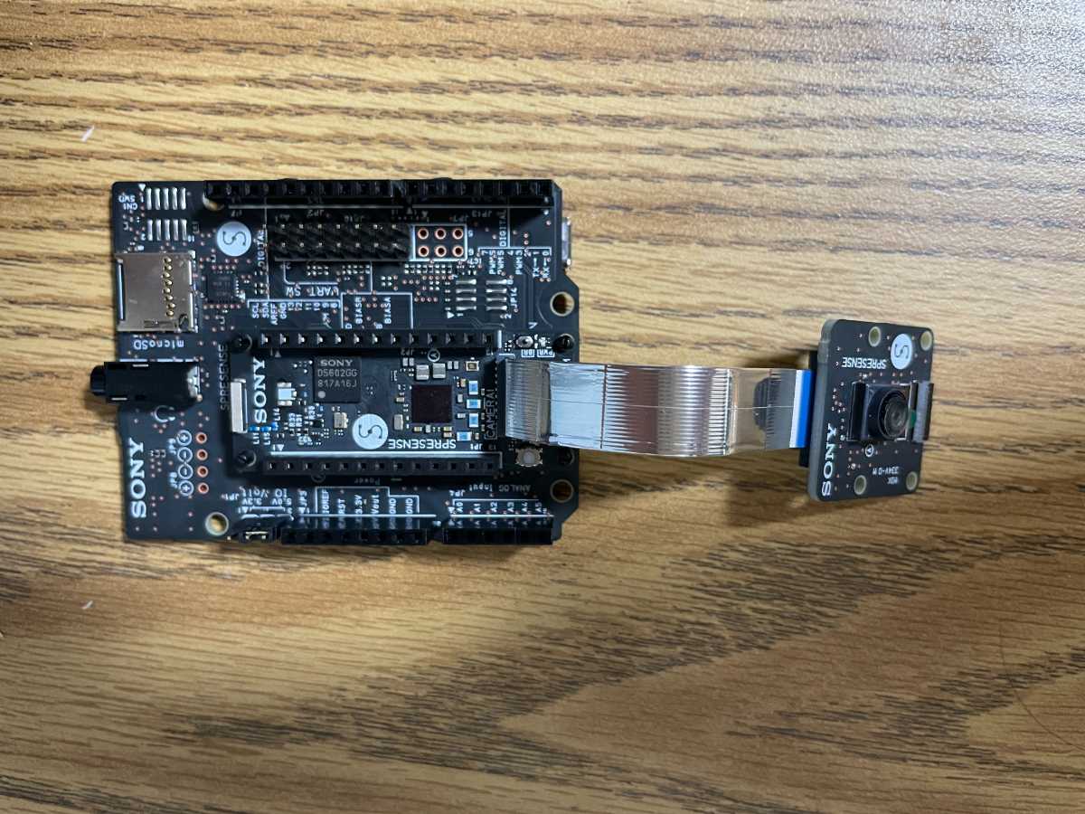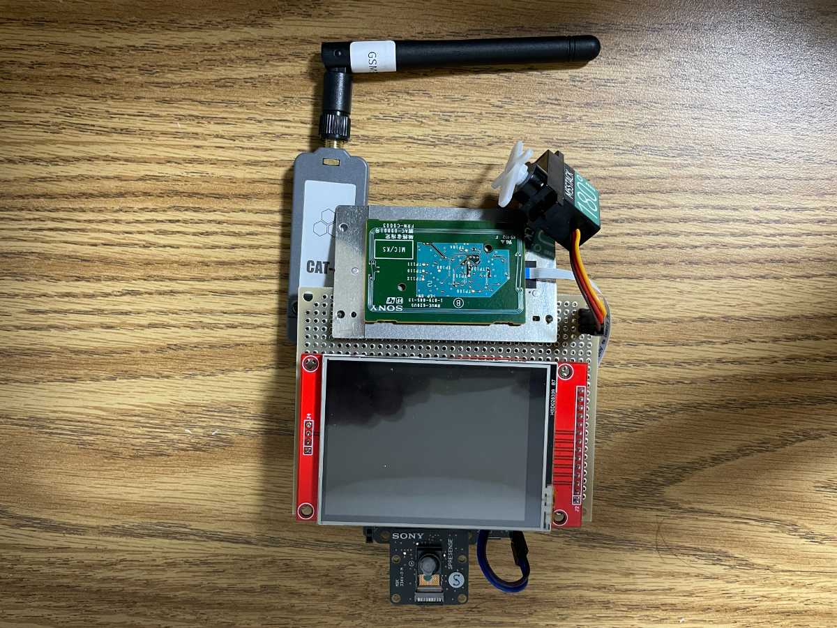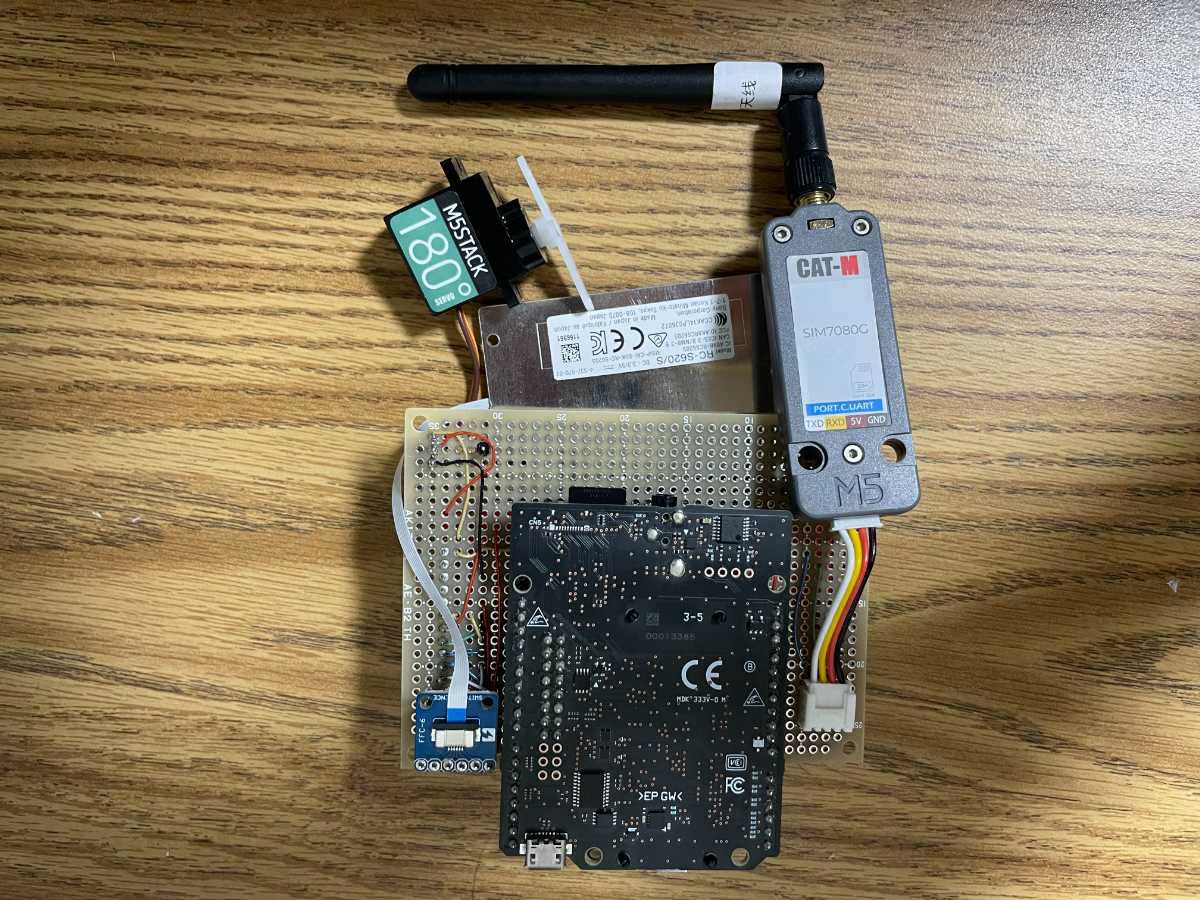 Spresense本体と本プロダクト用SpresenseHATをベースとし、各部品をつけた、全体図を示します。
