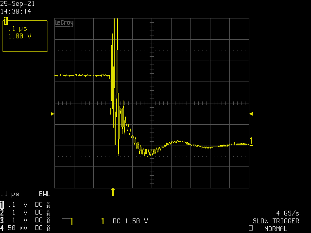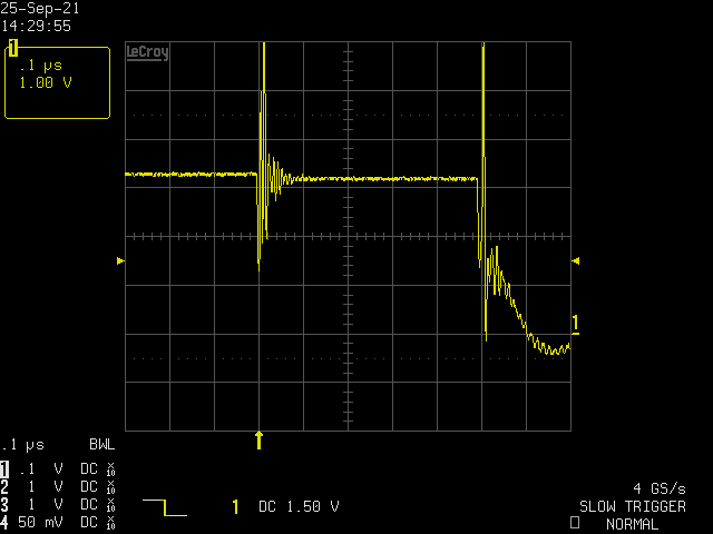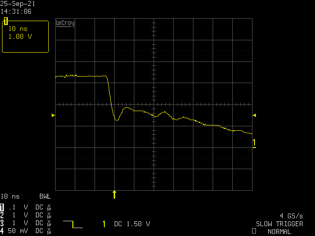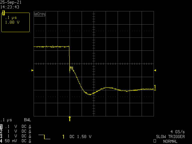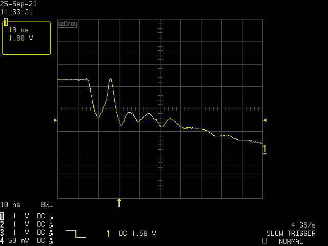 ボタンを押すと 3.3V から 1.2V 程度まで一気に下降した後、1.8V 付近まで揺り戻しがあり、そこから細かい上下を繰り返しながら 0.1μs ほどで GND レベルに落ちています。GND に落ちた後もそこで止まらず、ゆらゆらと電圧が変動しています。完全に落ち着くのに 1μs 程度かかるようです。