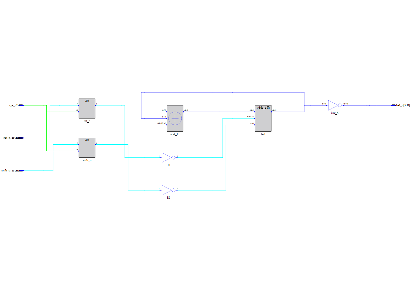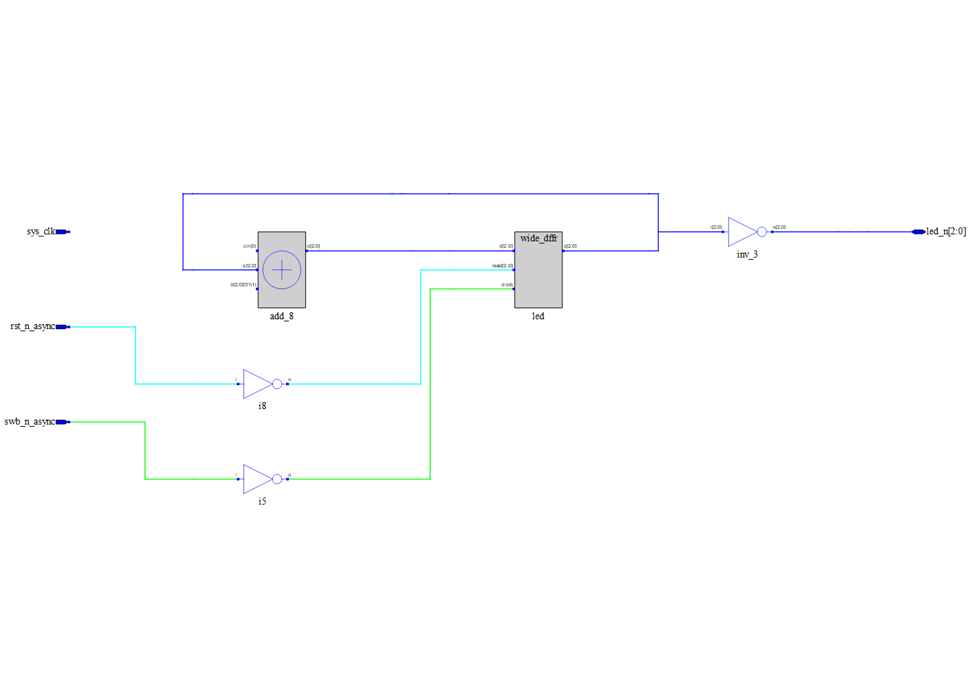 led はフルカラー LED です。led[0] が緑、led[1] が青、led[2] が赤に接続されています。negedge swb_n_async のときに LED の点灯状態を切り替えるようにしているので、スイッチを押したときには切り替わり、離したときは何も起きないで欲しいです。しかし、現実はそうはなりませんでした。