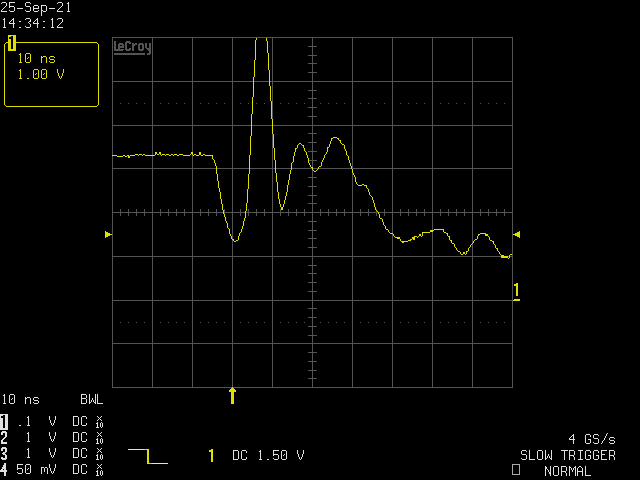 オシロで1目盛り10nsで測定したときの振動は0.1nFと配線のインダクタ成分で共振している波形じゃないかと思いました。それにしても、瞬間的にFPGAを壊しそうなくらいの電圧がでていることがあることには驚きました。
