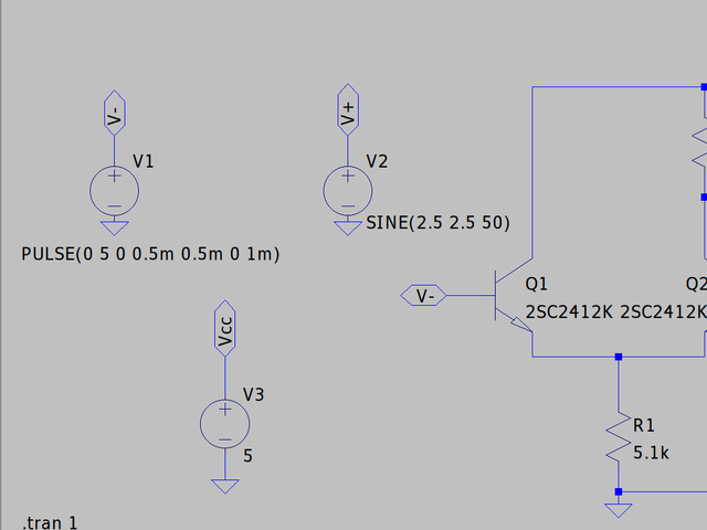 ちなみにですがこの回路、Q2をoffしきるにはVcc-Q2のVBE(約0.6V)以上かける必要があります。そのため信号電圧もそうなります。それより信号電圧が低いとQ2とQ1が同時にonし、貫通電流が流れて故障します。