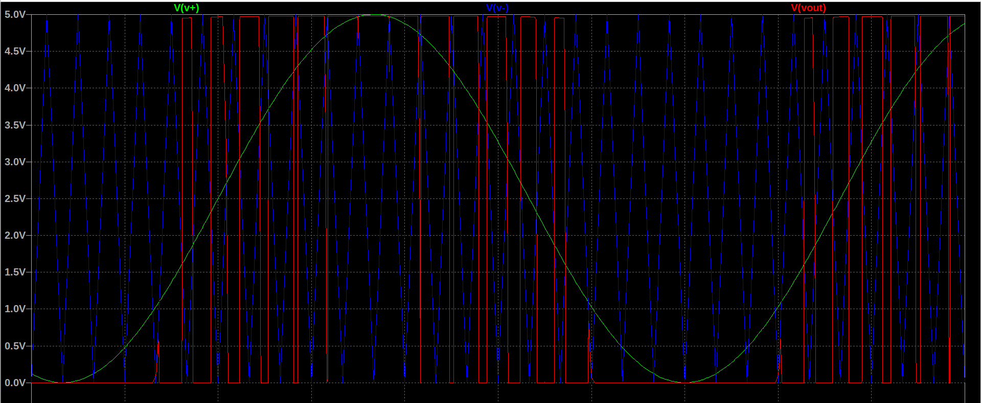 2つの電圧V+とV-を比較し、V+がV-を上回るとVoutが1になります。